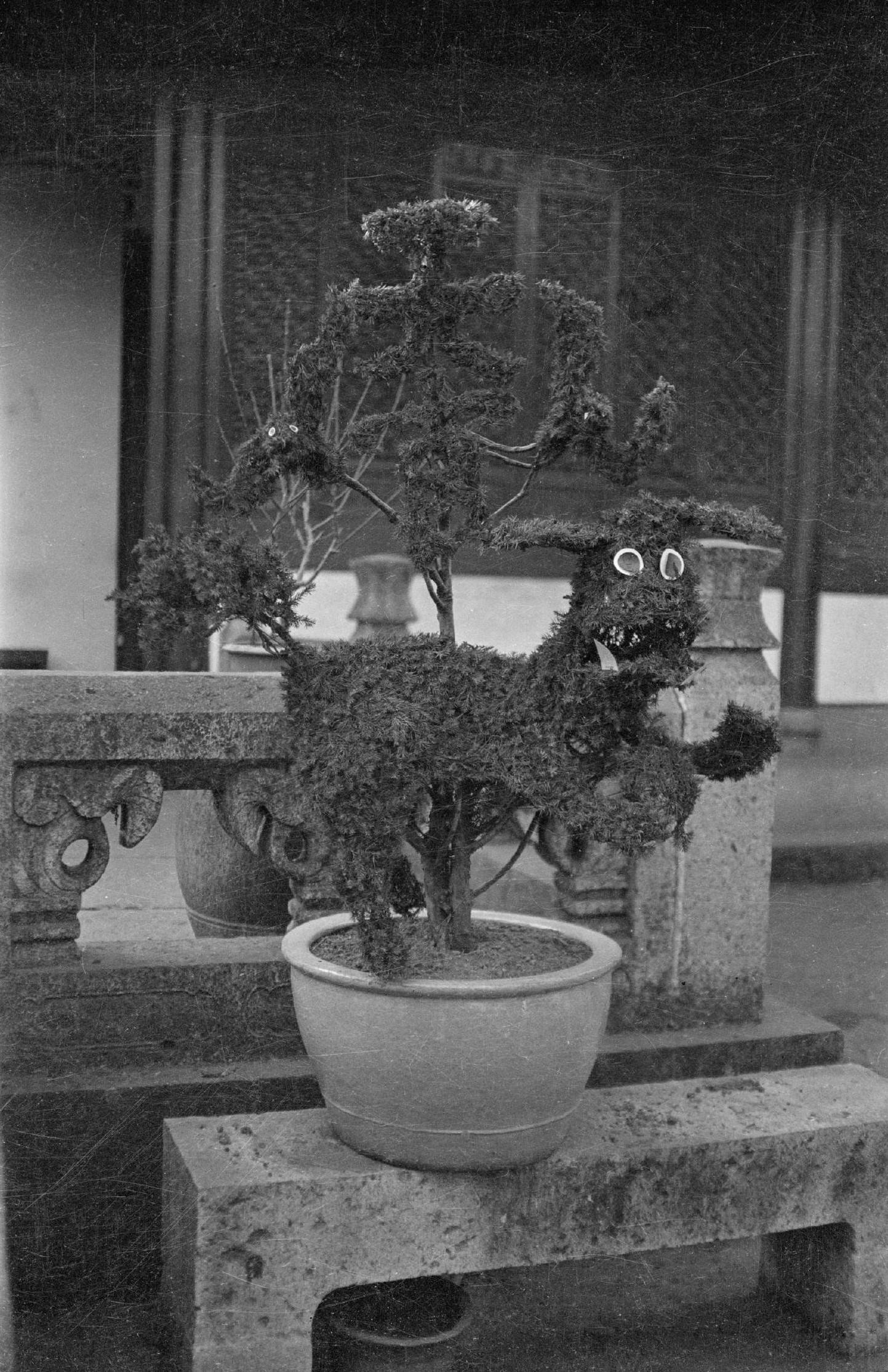 18、开封古城的一处庭院,盆景竟然修成了一条狗的模样,栩栩如生,很是巧妙。
