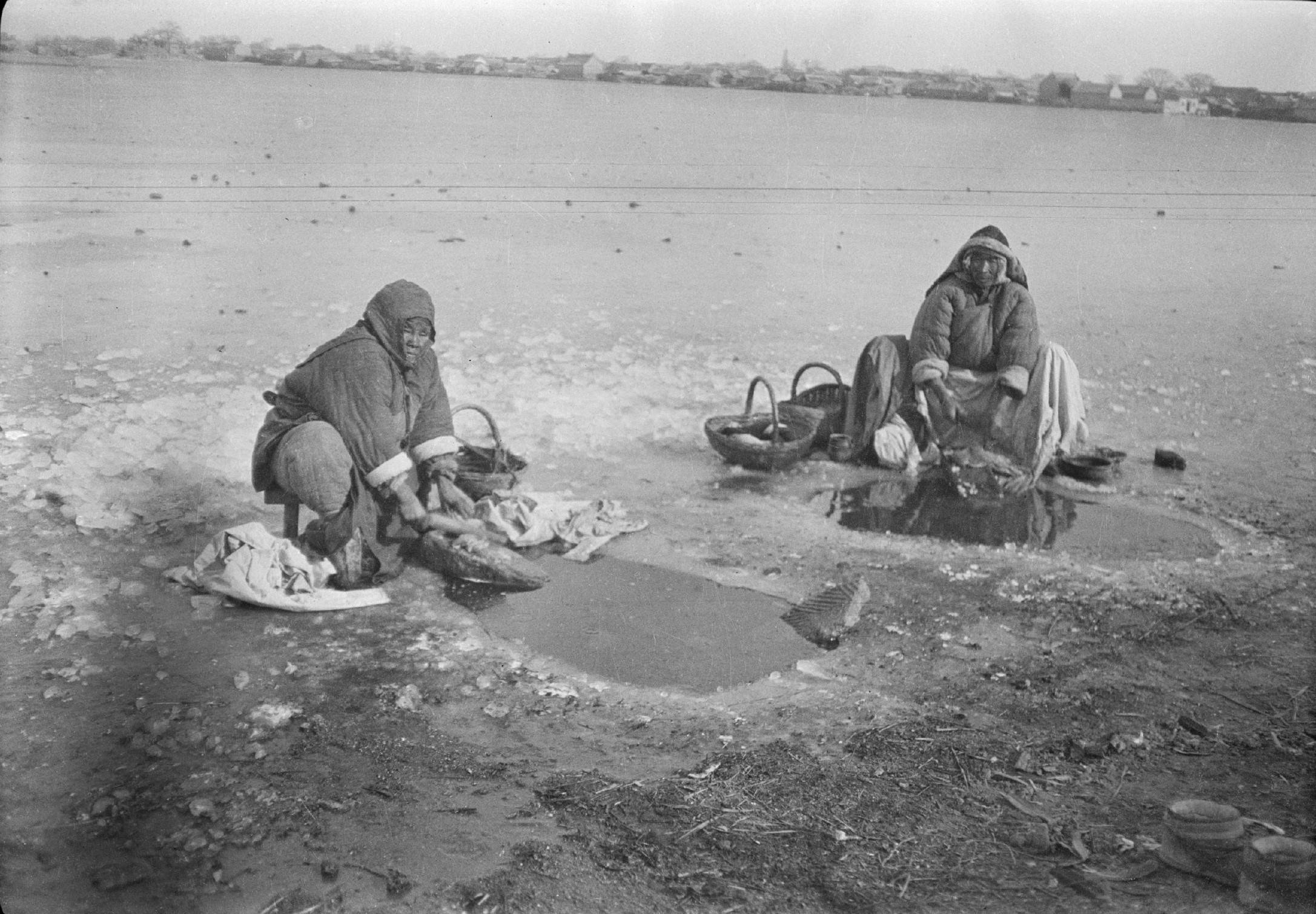 25、在开封的龙亭附近,黄河上已经结上厚冰,两位老妇人,将冰凿开,正在洗着衣物,对岸的民居清晰可见。
