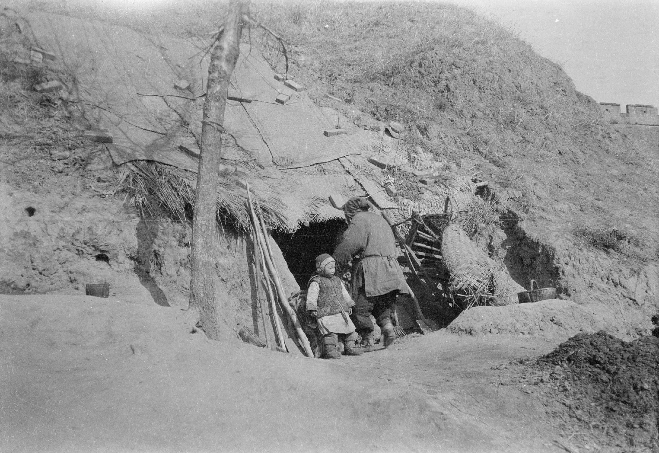 19、位于开封古城北门附近的一处窑洞人家,奶奶带着孩子正在门口晒太阳,右侧后方隐隐可见城墙的城垛。