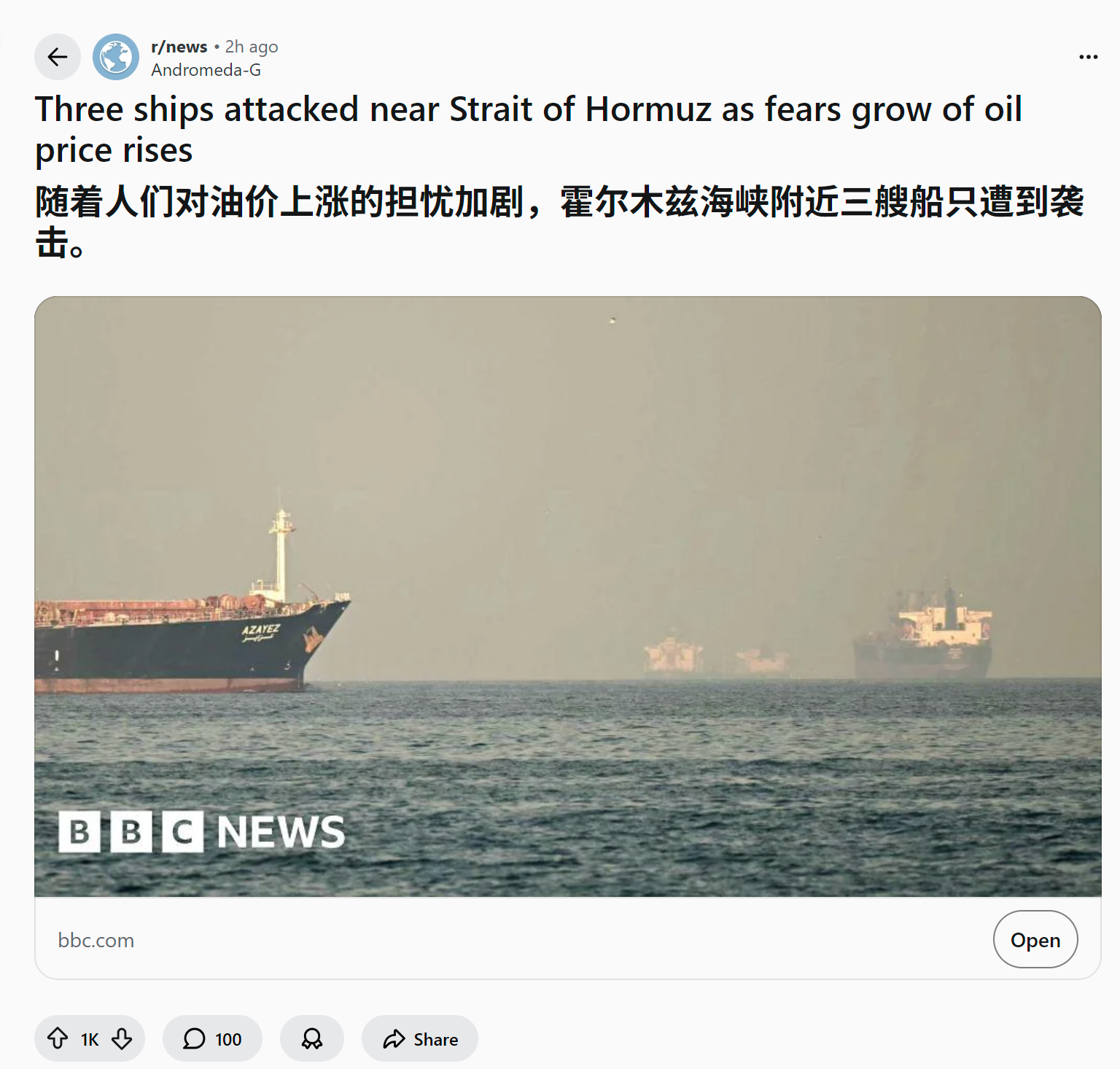 随着人们对油价上涨的担忧加剧,霍尔木兹海峡附近三艘船只遭到袭击。