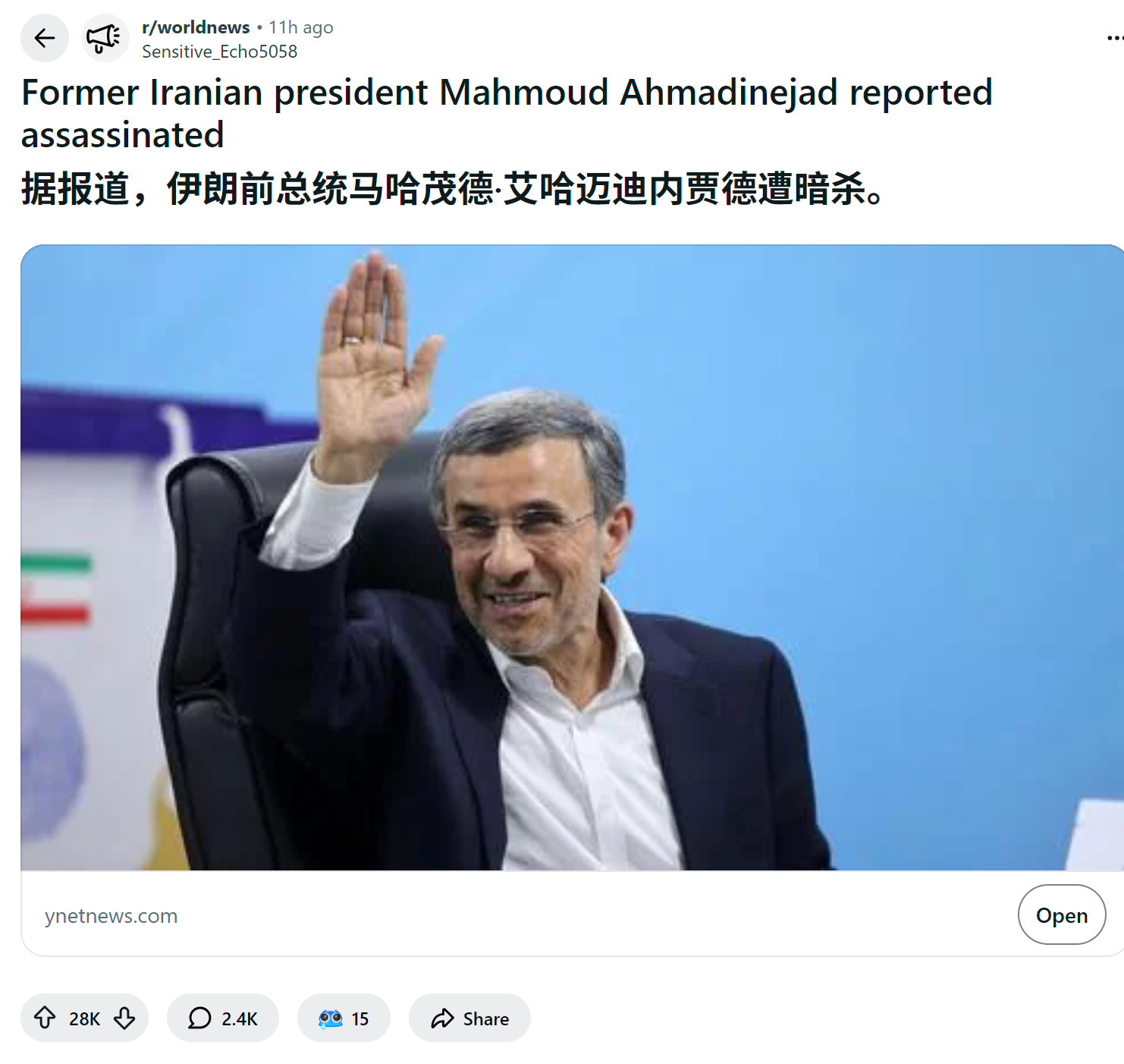 - reddit爆火 伊朗总统称该国正与美国、以色列和欧洲处于“全面战争”之中