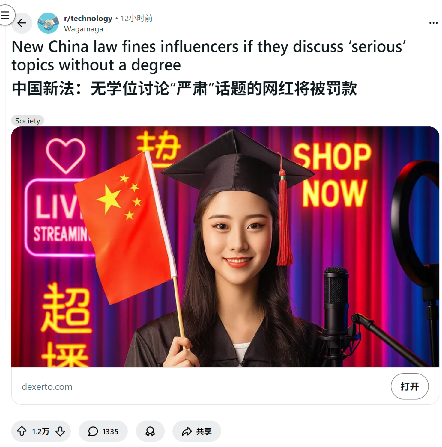 中国新法:无学位讨论“严肃”话题的网红将被罚款