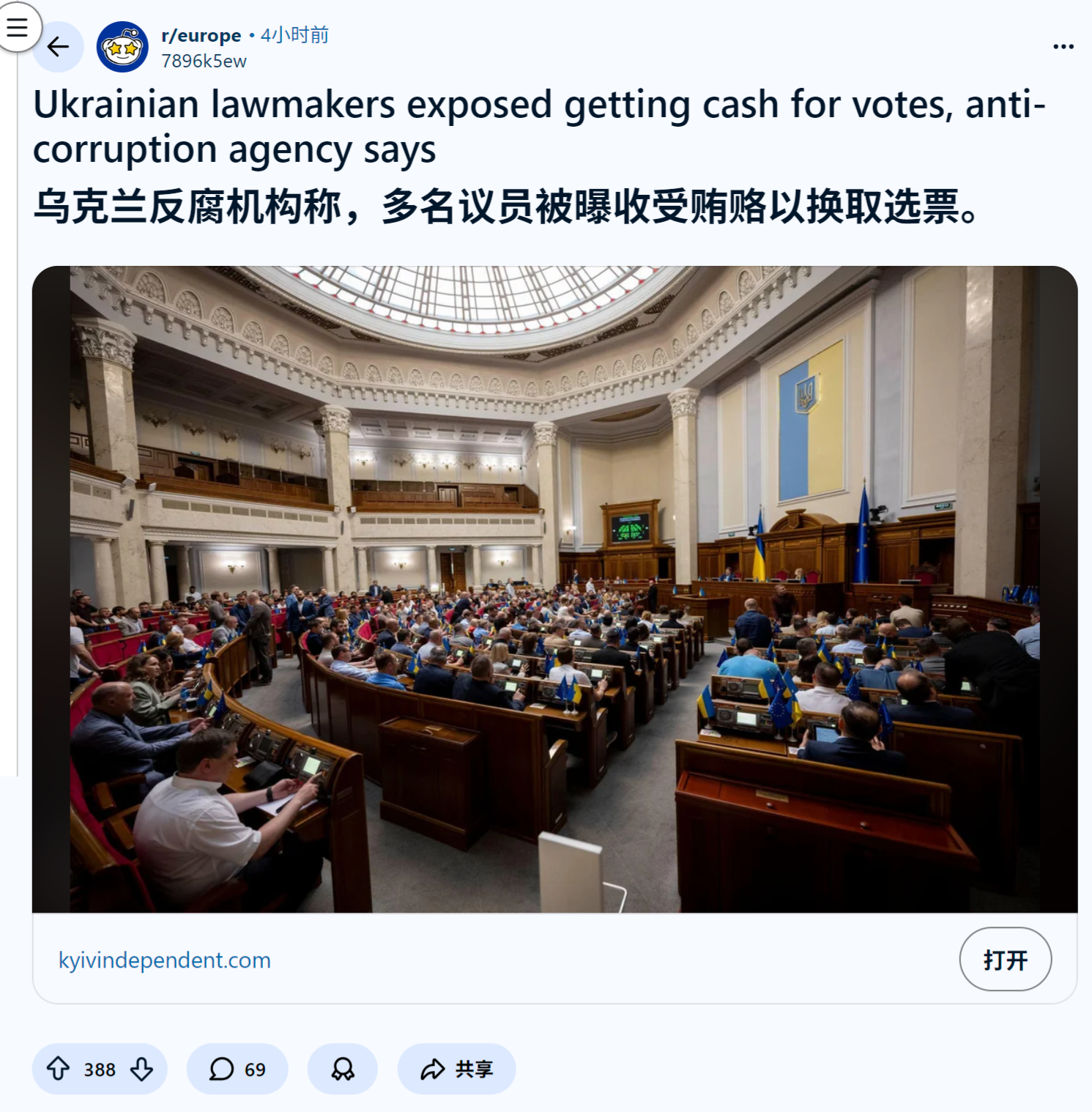 reddit热议 乌克兰反腐机构称,多名议员被曝收受贿赂以换取选票。