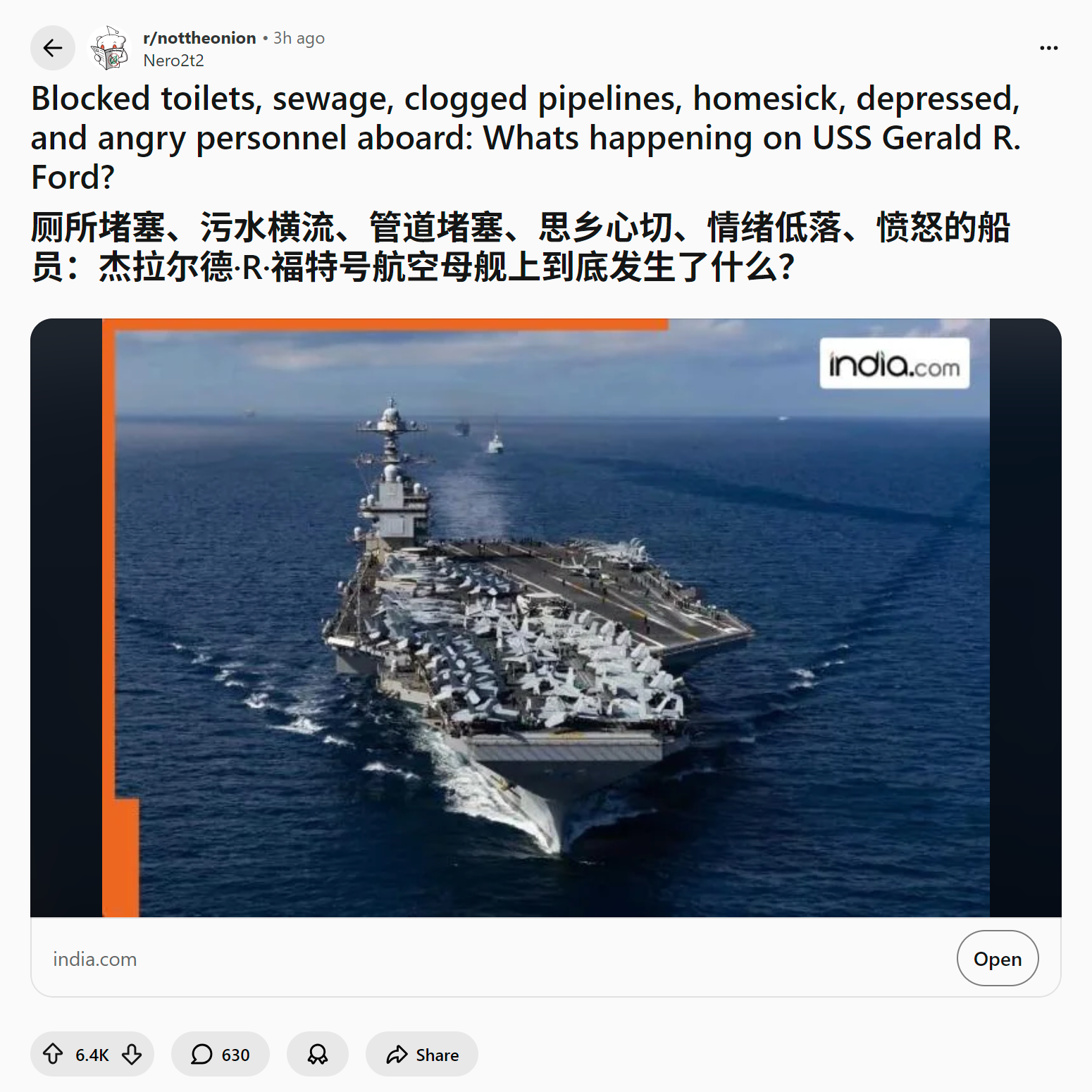 reddit爆火 美国人怎么看福特号航空母舰上厕所堵塞、污水横流、管道堵塞、思乡心切、情绪低落