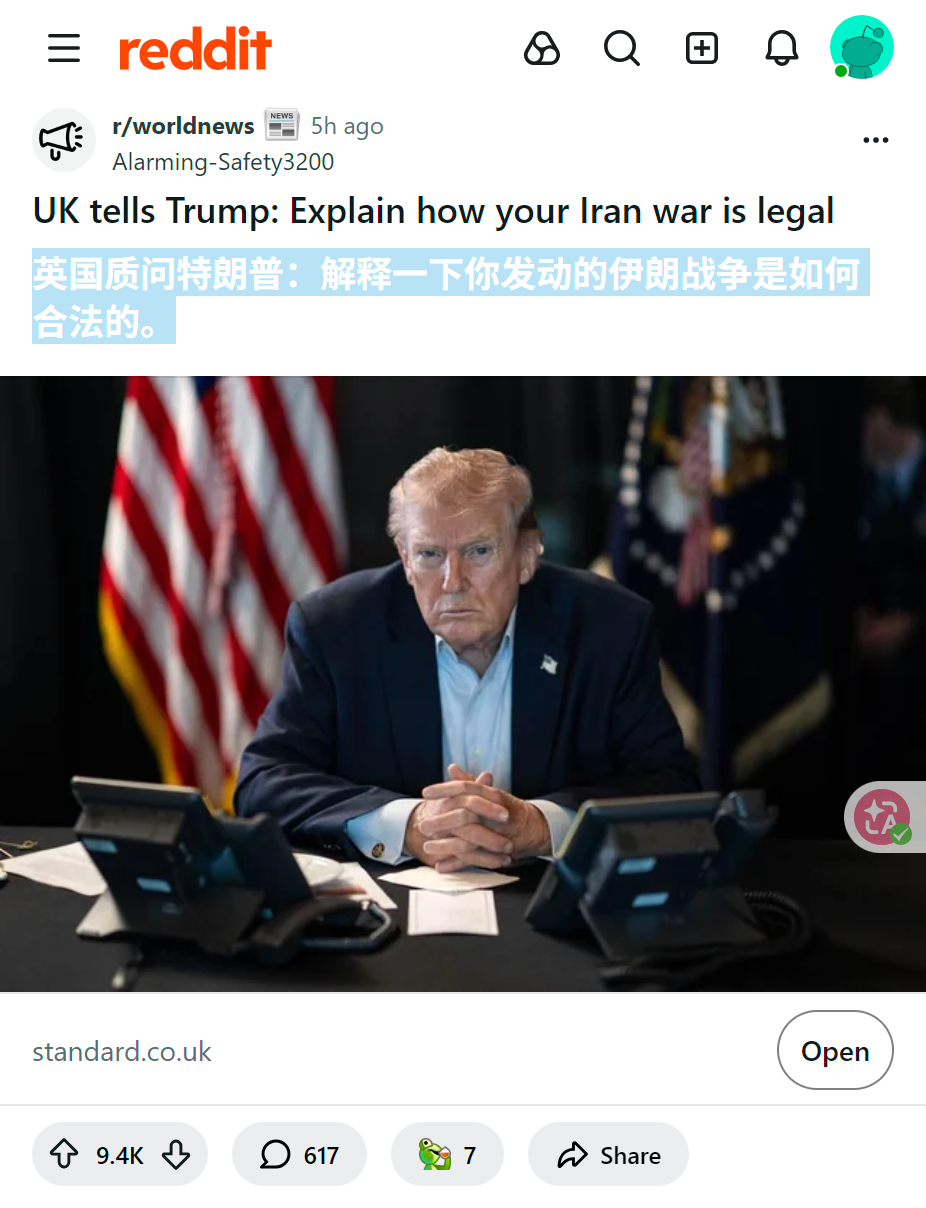 reddit热议 英国质问特朗普:解释一下你发动的伊朗战争是如何合法的。