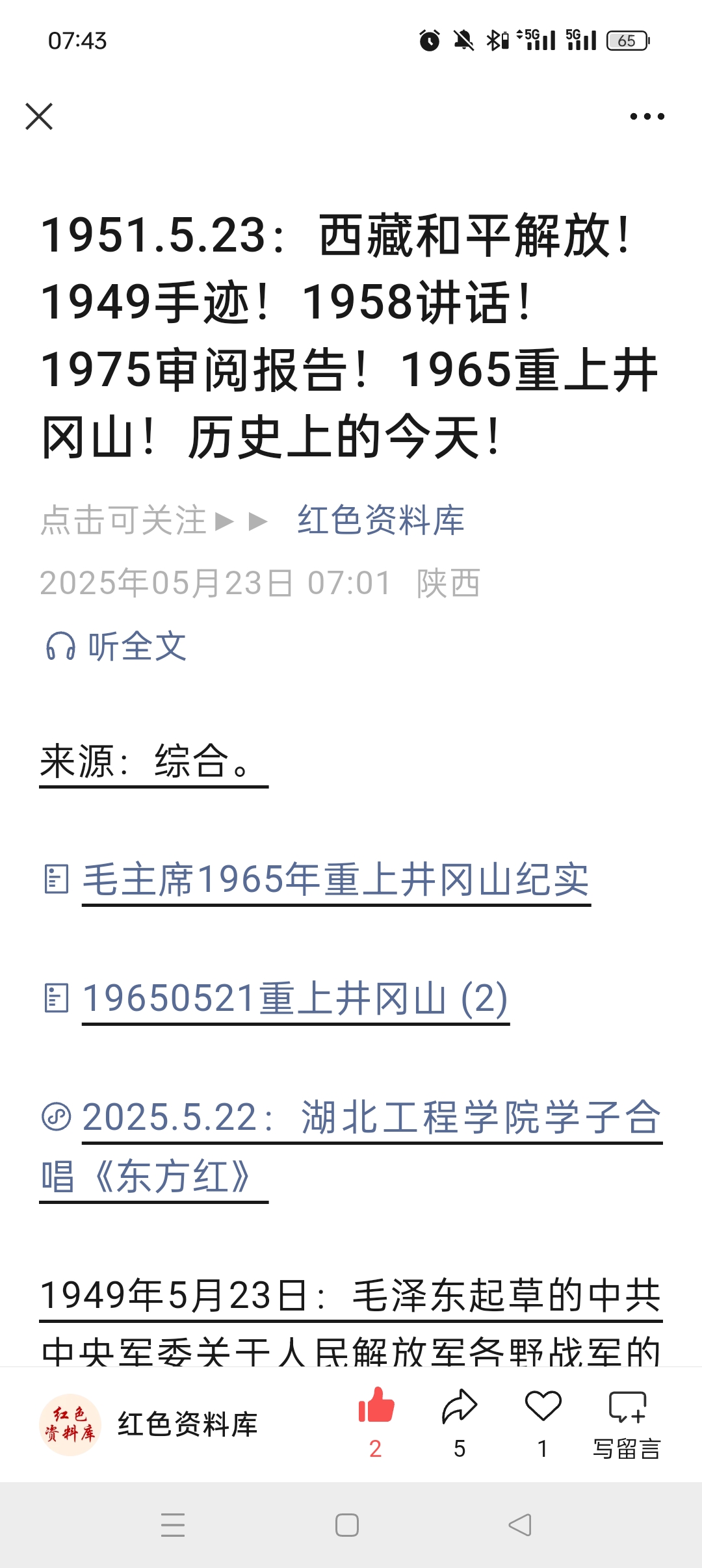 1951.5.23:西藏和平解放!1949手迹!1958讲话!1975审阅报告!1965重上井冈山!历史上的今天!