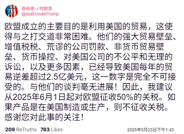 来源:https://www.reddit.com/r/StockMarket/comments/1kthjhp/50_tarrifs_on_eu_june_1st/