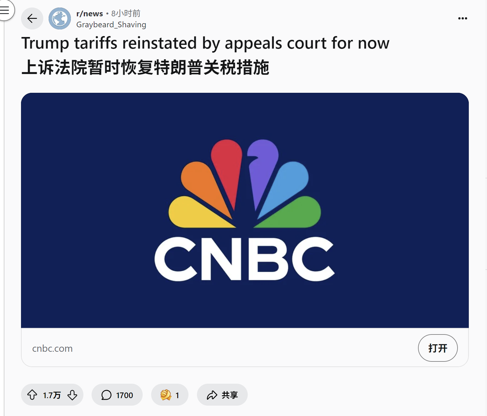 《外网reddit热评》上诉法院暂时恢复特朗普关税措施