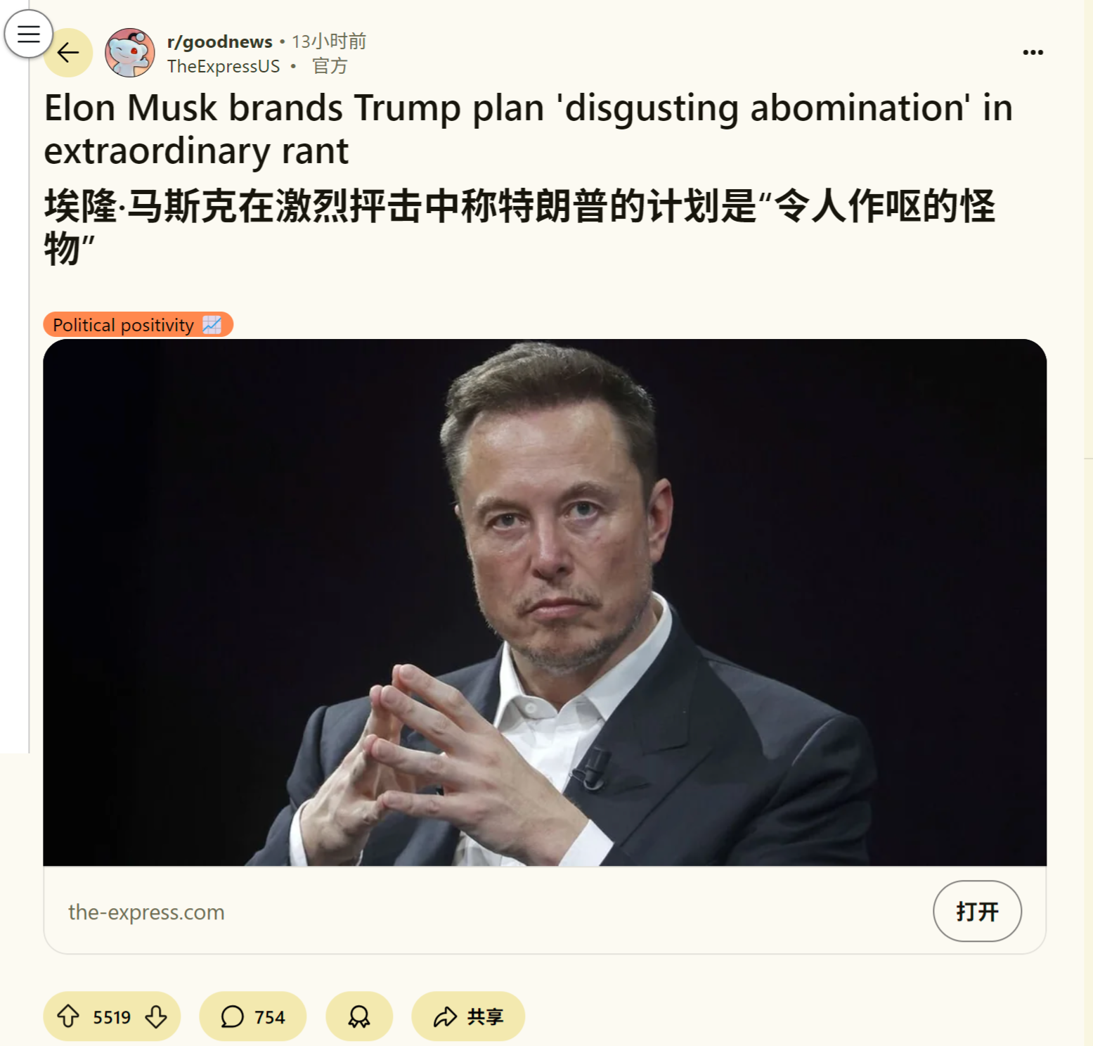 来源:https://www.reddit.com/r/goodnews/comments/1l2j4u2/elon_musk_brands_trump_plan_disgusting/