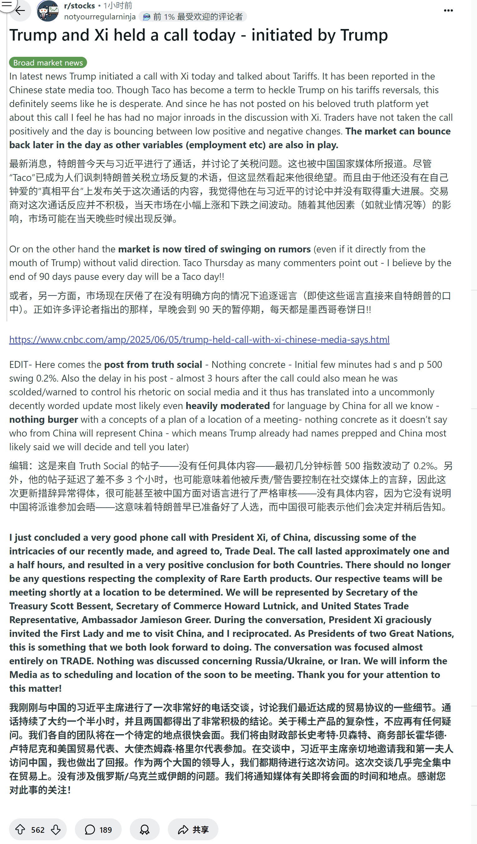 来源:https://www.reddit.com/r/stocks/comments/1l406pc/trump_and_xi_held_a_call_today_initiated_by_trump/