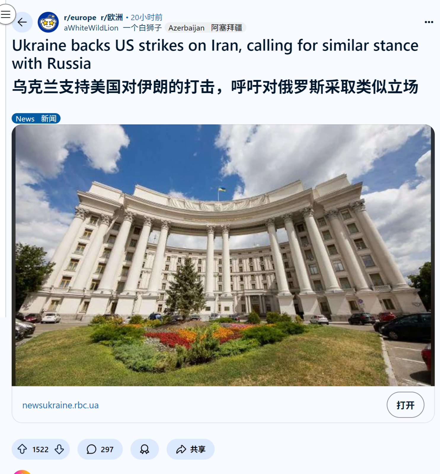 《外网reddit热评》欧洲人怎么看乌克兰支持美国对伊朗的打击,呼吁对俄罗斯采取类似立场