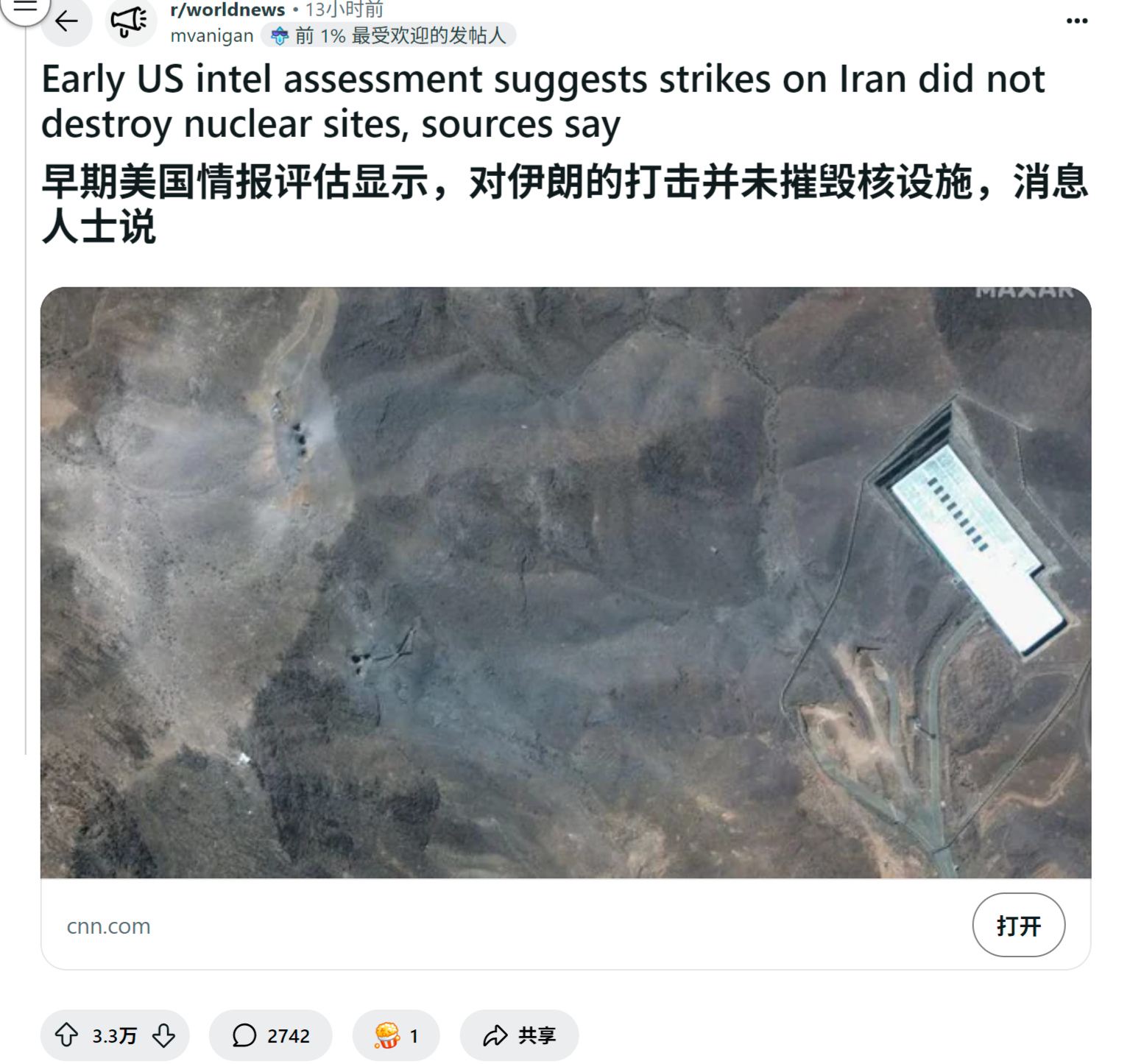 - 《外网reddit热评》美国人如何看美国军方已轰炸多个伊朗核设施