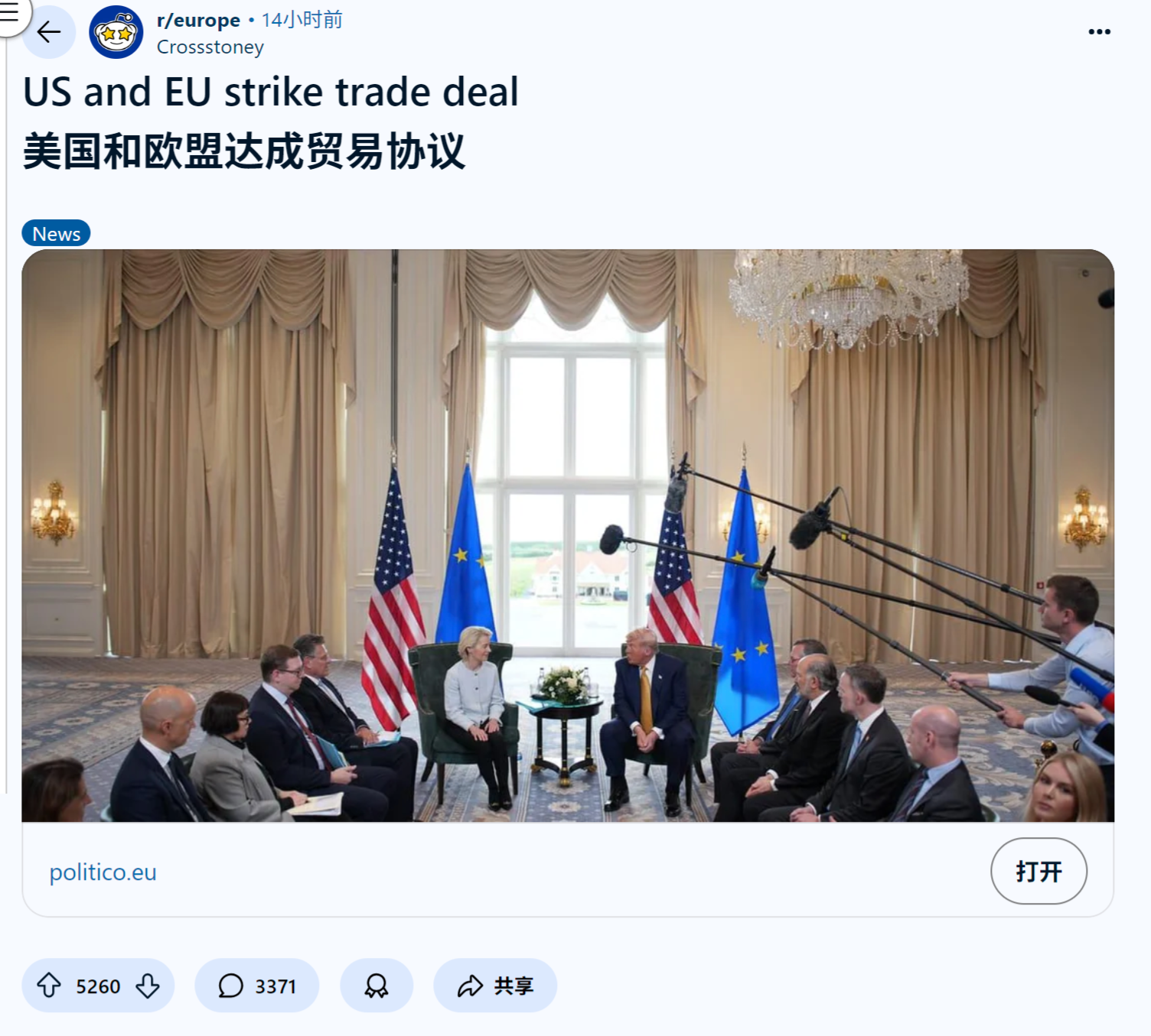 外网reddit热评 欧洲人怎么看美国和欧盟达成贸易协议