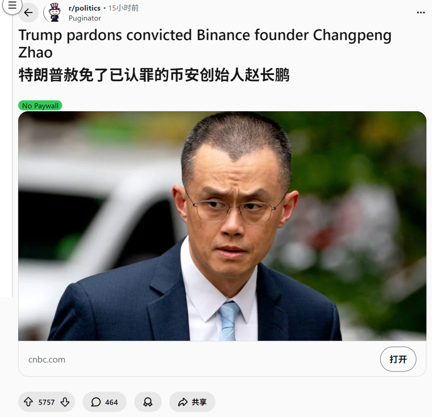 外网reddit怎么看特朗普赦免了已认罪的币安创始人赵长鹏