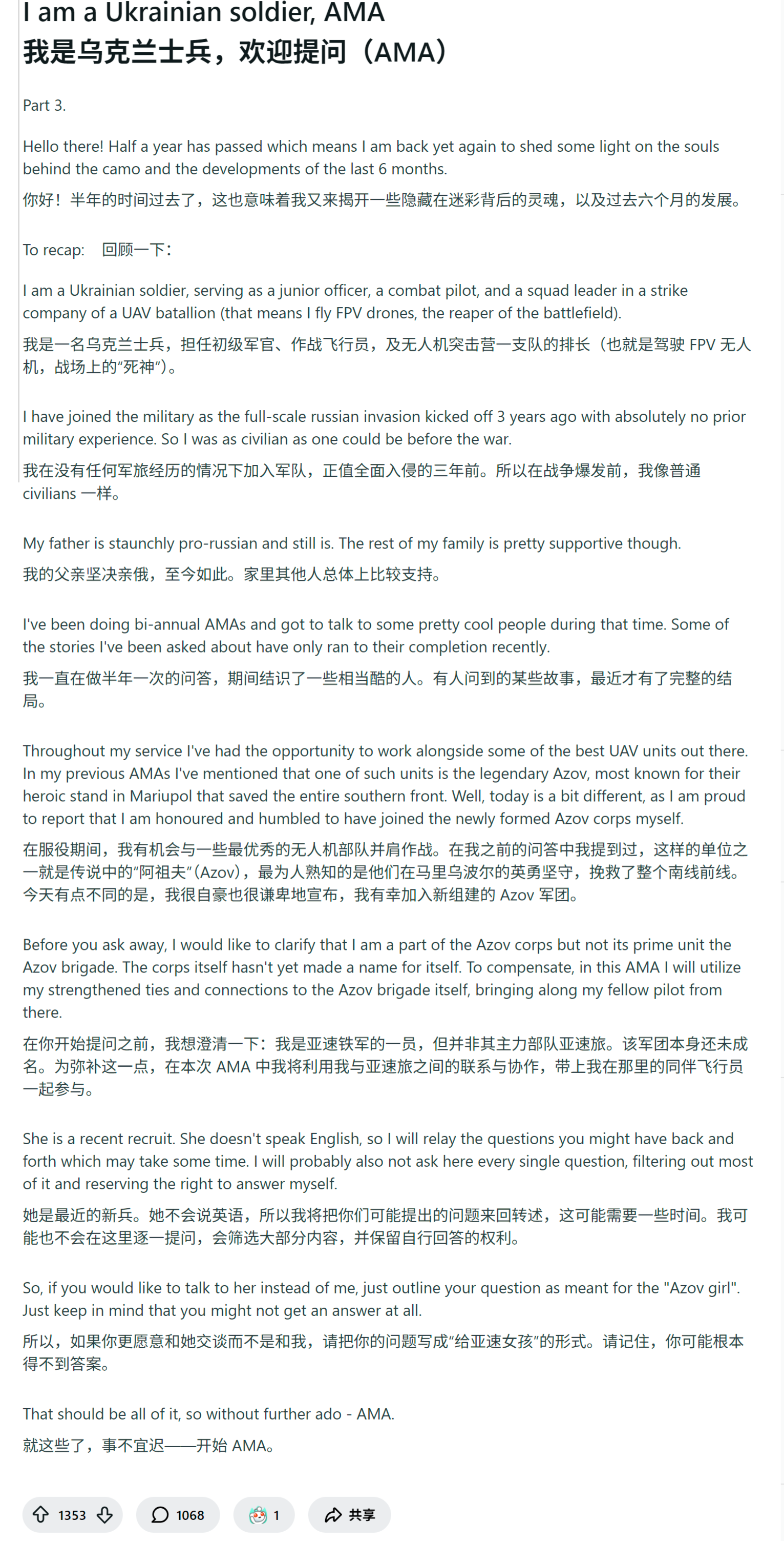 来源:https://www.reddit.com/r/AMA/comments/1obajtg/i_am_a_ukrainian_soldier_ama/