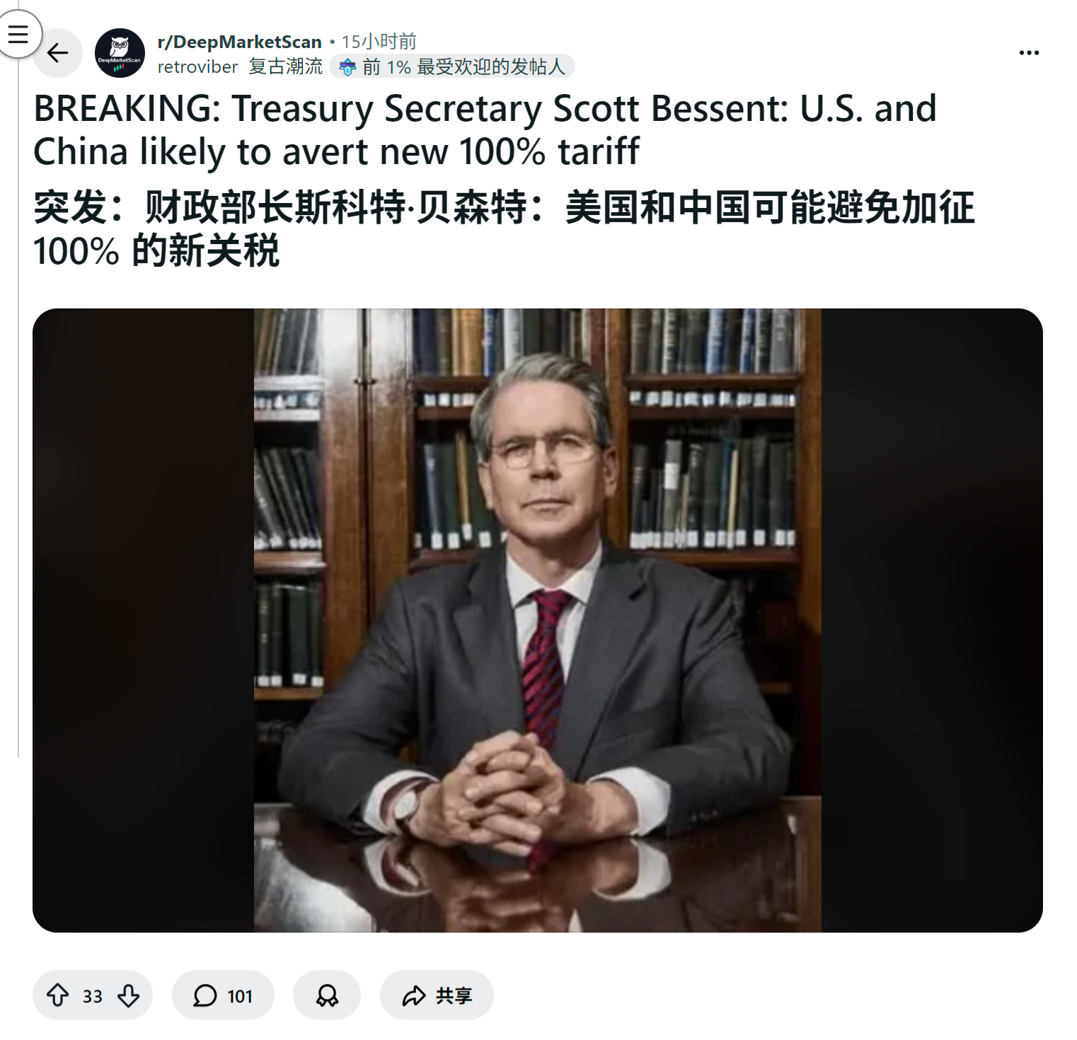 突发:财政部长斯科特·贝森特:美国和中国可能避免加征 100% 的新关税