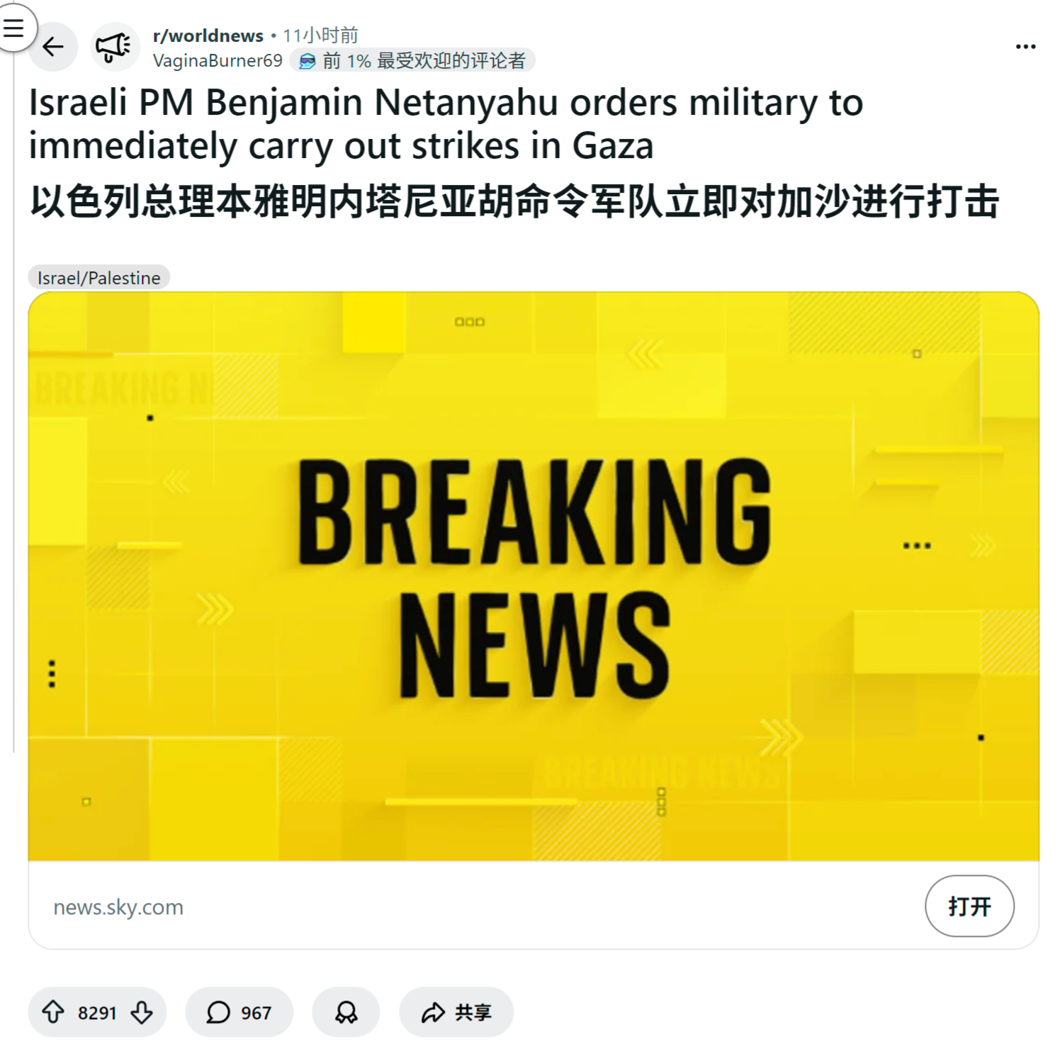 reddit热议:以色列总理本雅明内塔尼亚胡命令军队立即对加沙进行打击