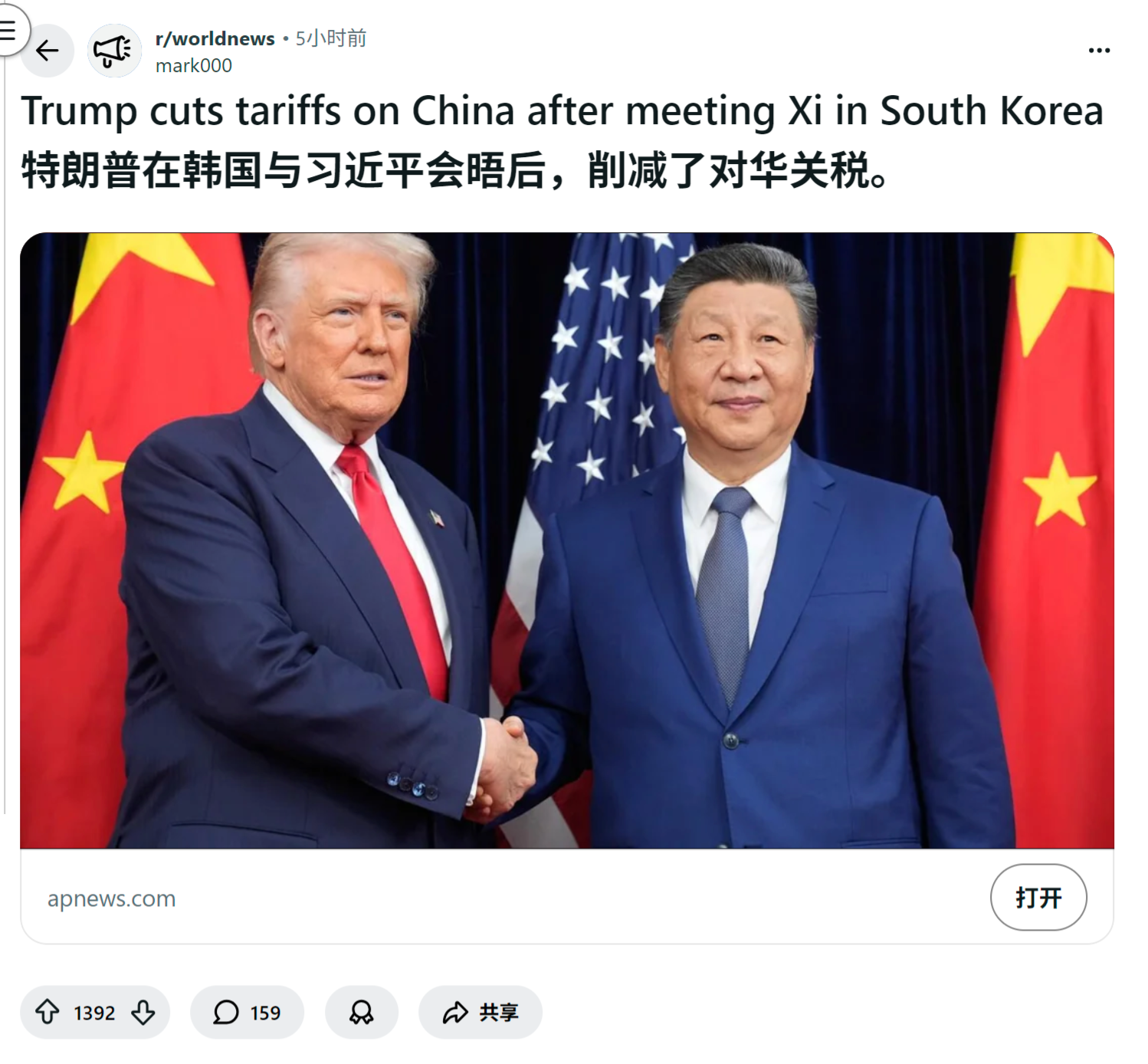 来源:https://www.reddit.com/r/worldnews/comments/1ojsbhc/trump_cuts_tariffs_on_china_after_meeting_xi_in/