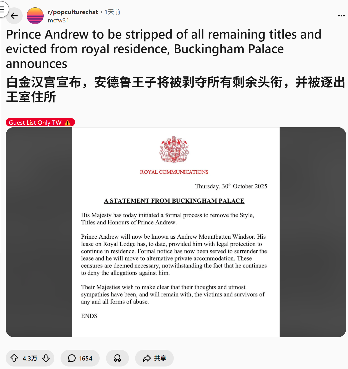 reddit热议:外国人怎么看安德鲁王子将被剥夺所有剩余头衔,并被逐出王室住所