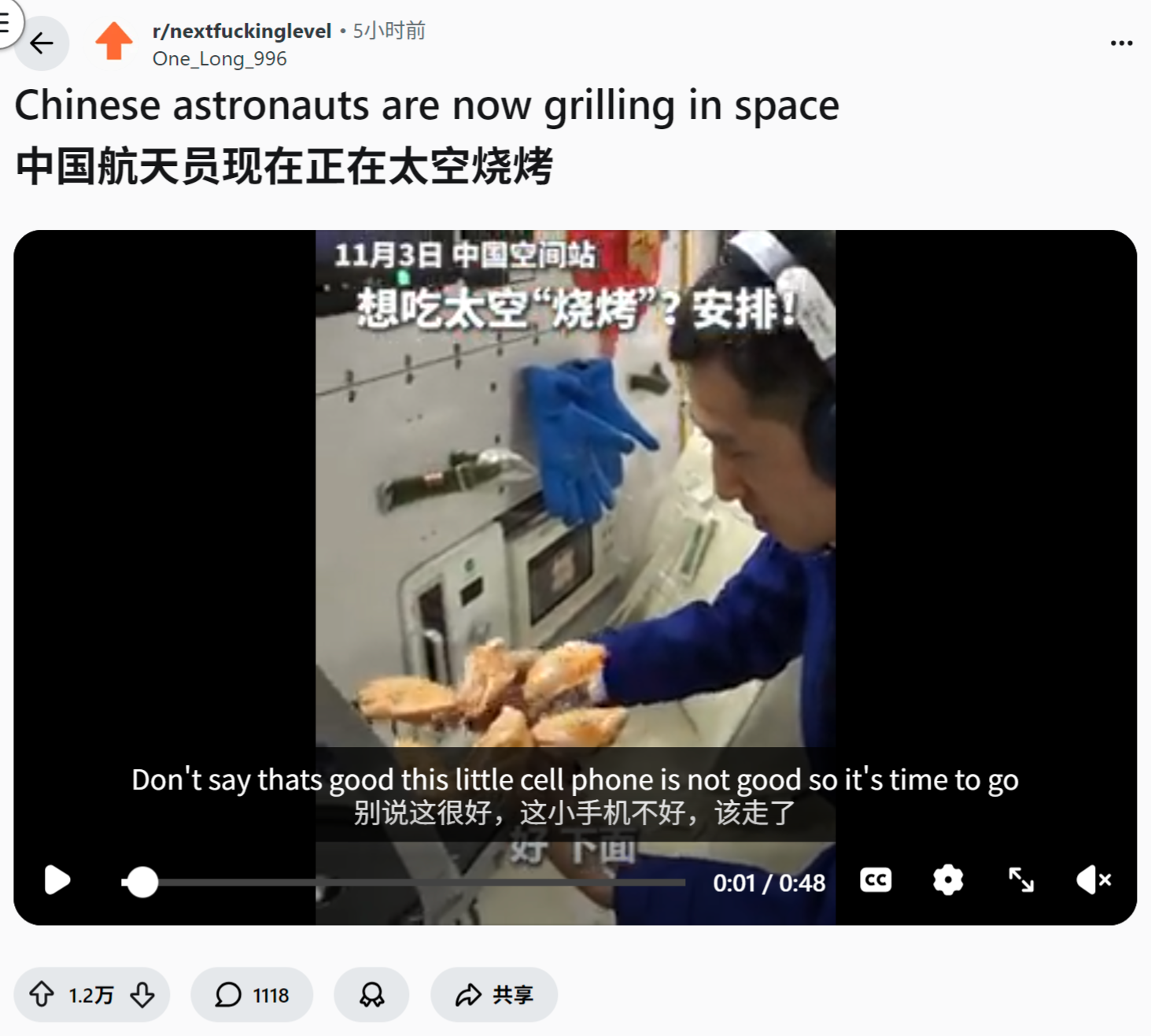外网reddit热议 老外怎么看中国航天员现在正在太空烧烤