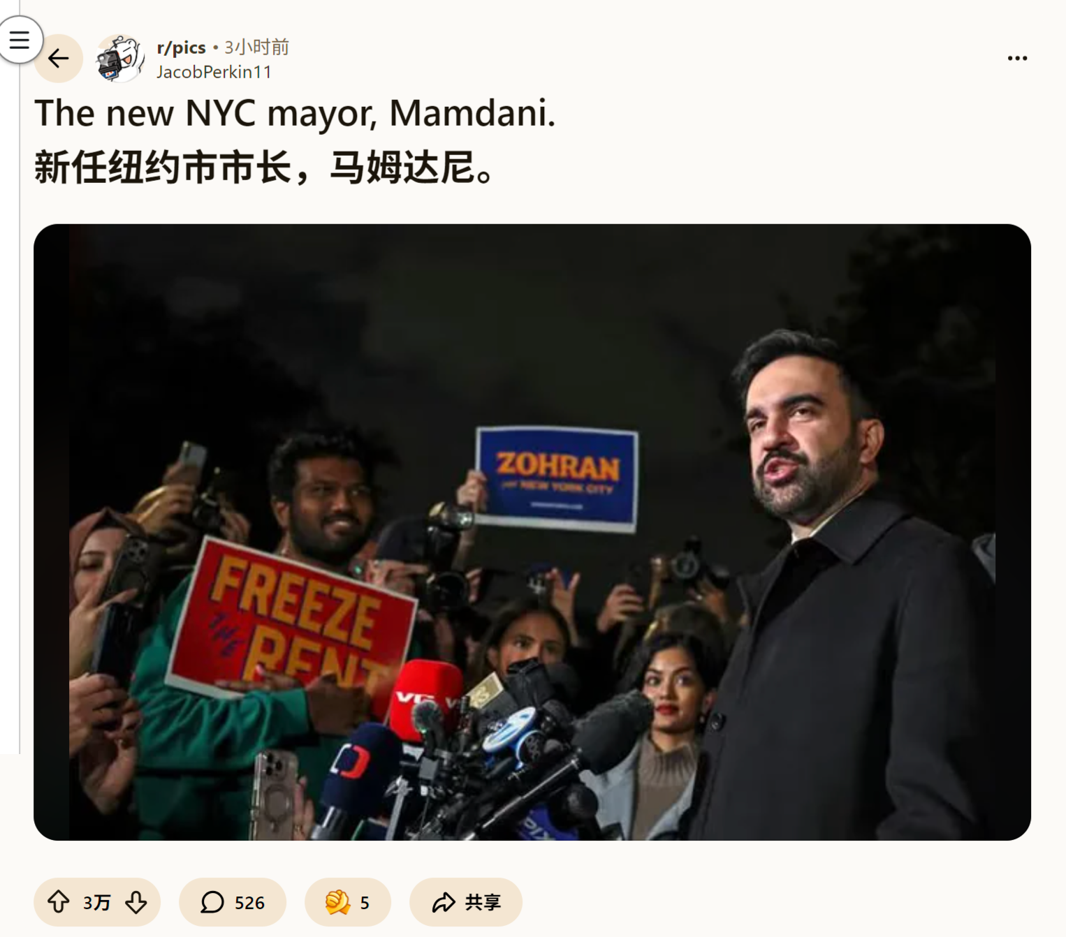 来源:https://www.reddit.com/r/politics/comments/1ooql8z/mamdani_wins_nyc_mayoral_race/
