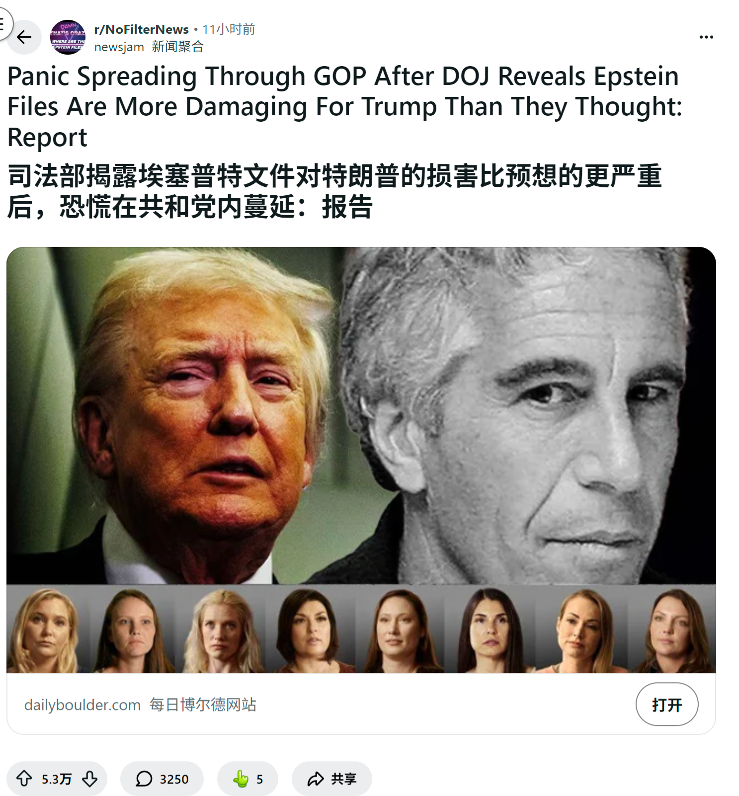 reddit爆火 司法部揭露特朗普或严重涉及爱泼斯坦文件,共和党恐慌