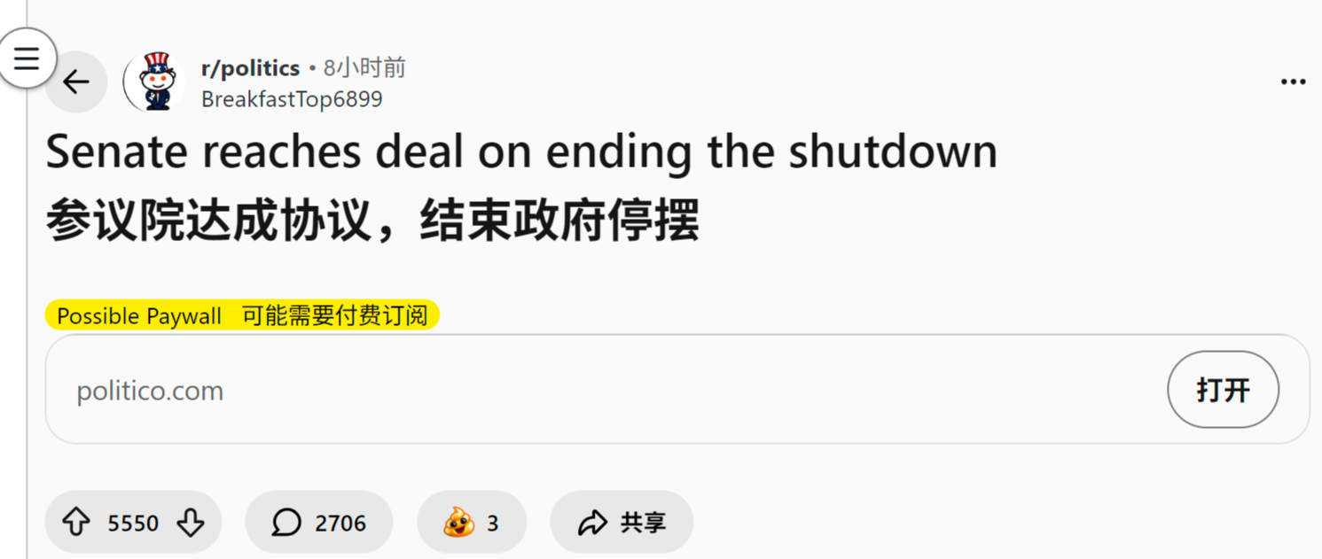 来源:https://www.reddit.com/r/politics/comments/1osz2hl/senate_reaches_deal_on_ending_the_shutdown/