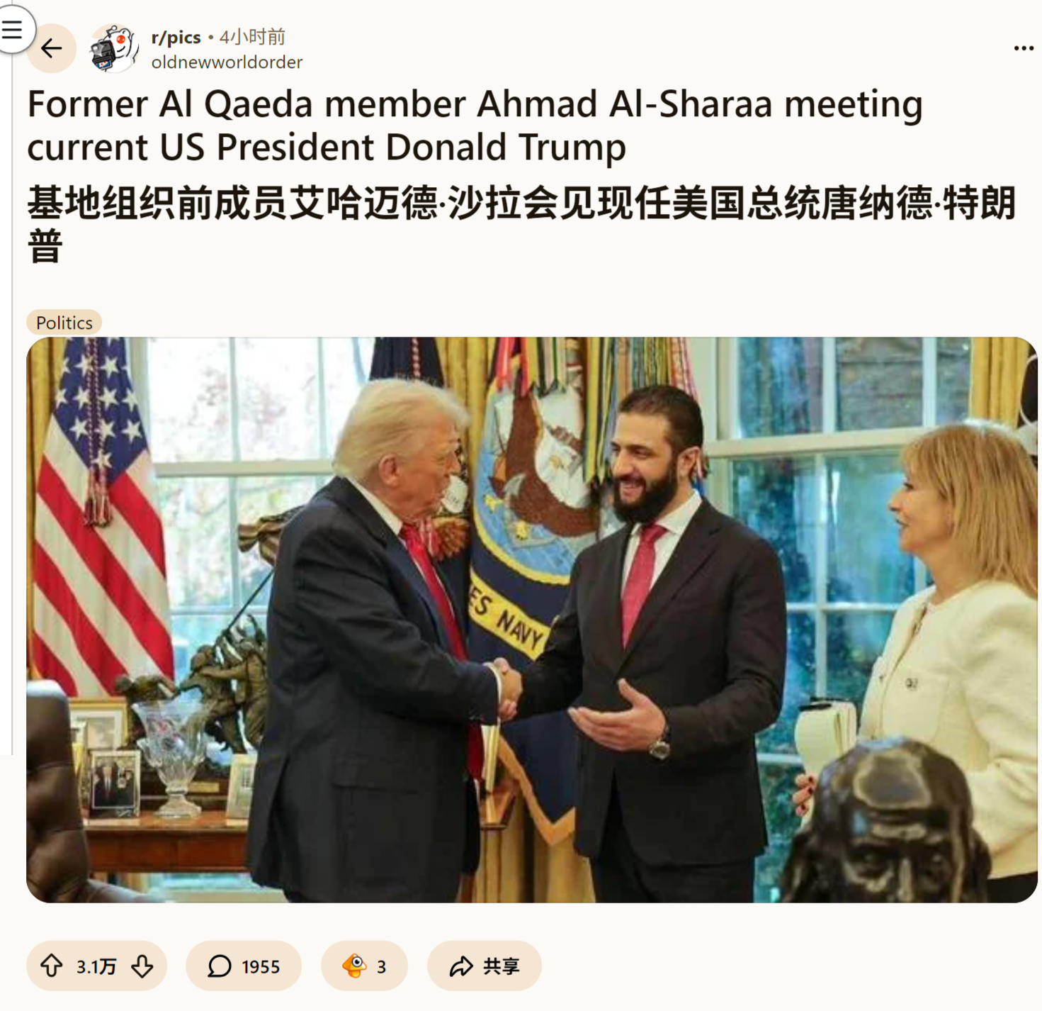 来源:https://www.reddit.com/r/pics/comments/1ouqz3k/former_al_qaeda_member_ahmad_alsharaa_meeting/