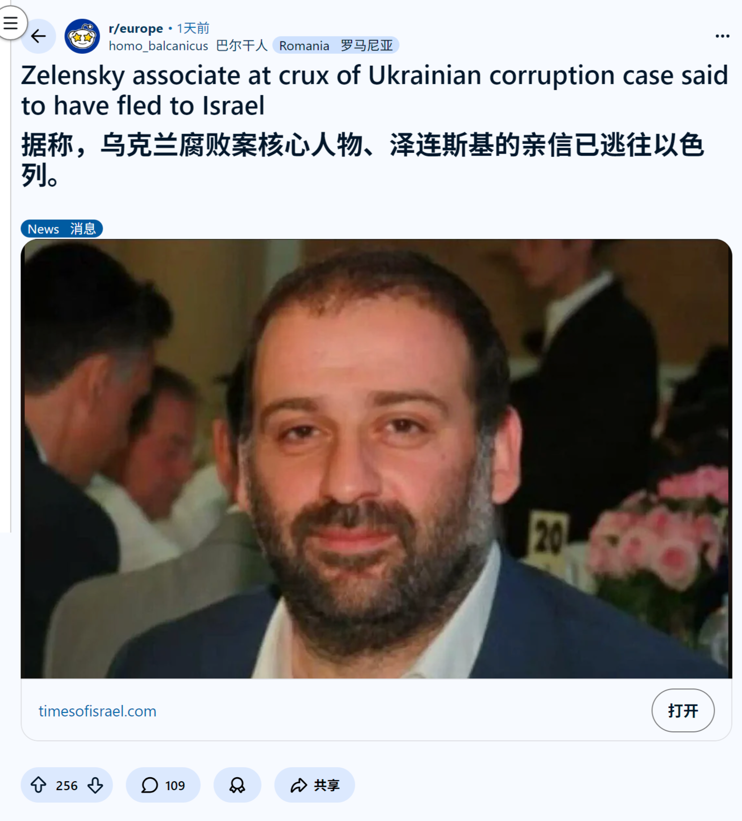 欧洲人怎么看 乌克兰腐败案核心人物、泽连斯基的亲信已逃往以色列。