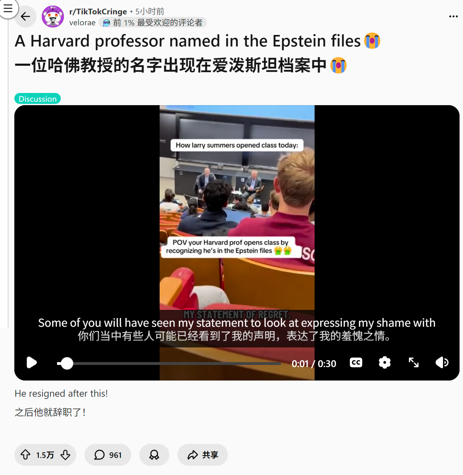 reddit热议 奥巴马时期财长,哈佛大学前校长与中国某女学生出现爱泼斯坦档案