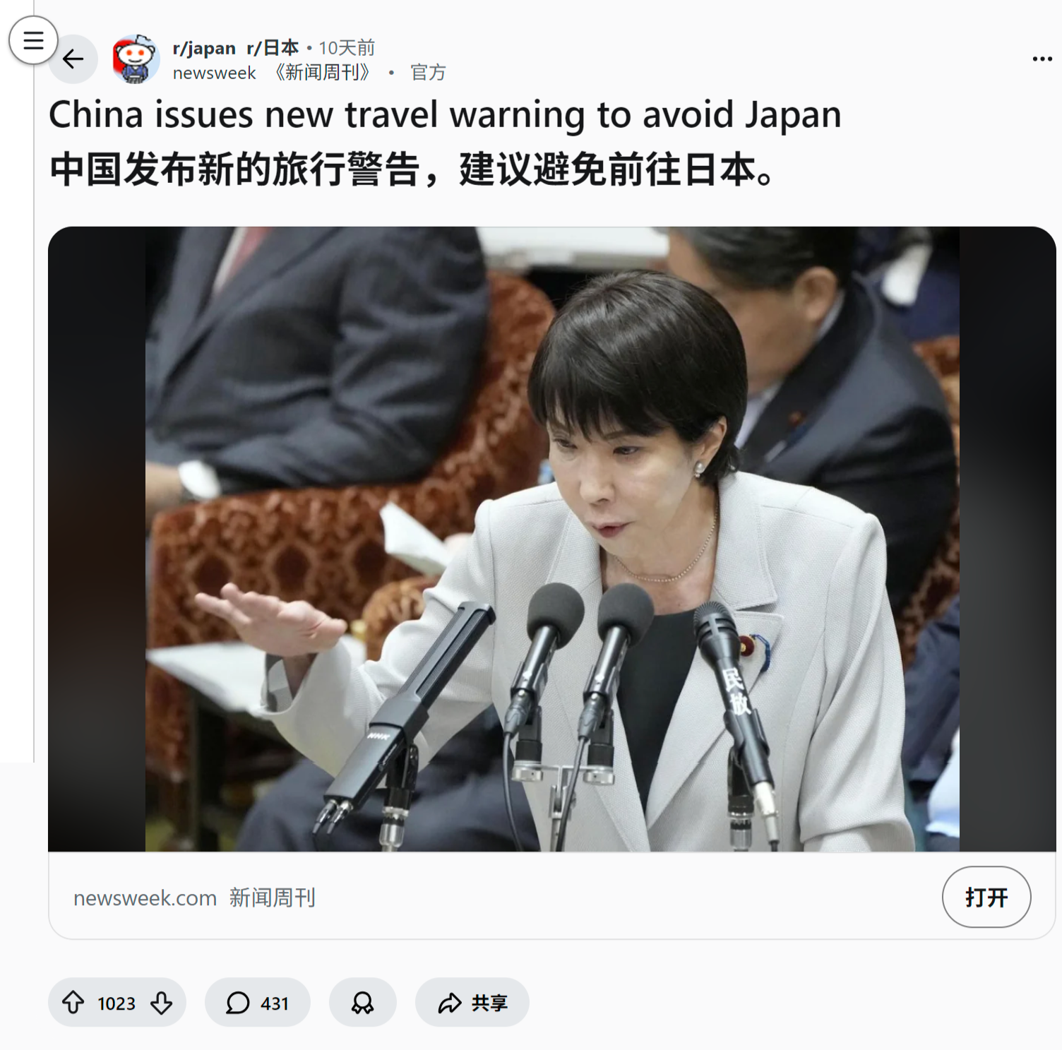 来源:https://www.reddit.com/r/japan/comments/1ox2fei/china_issues_new_travel_warning_to_avoid_japan/