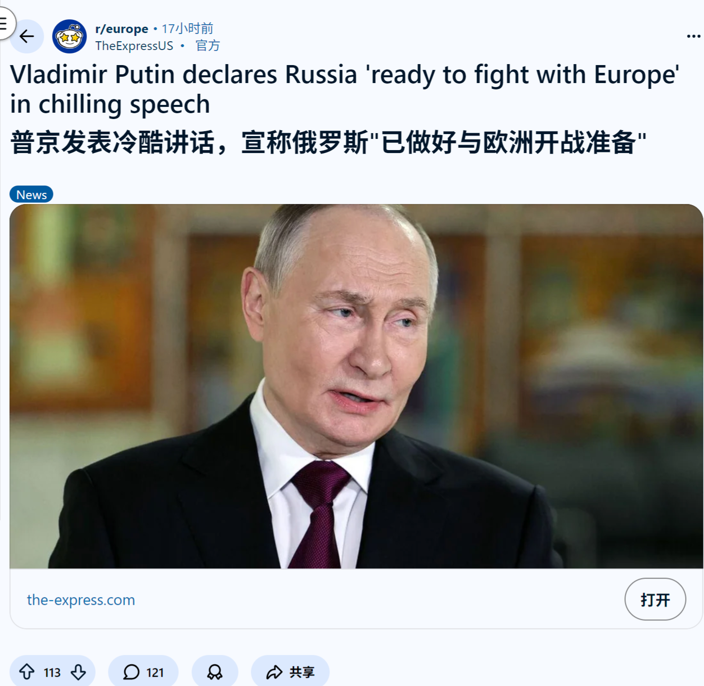 普京发表冷酷讲话,宣称俄罗斯"已做好与欧洲开战准备"