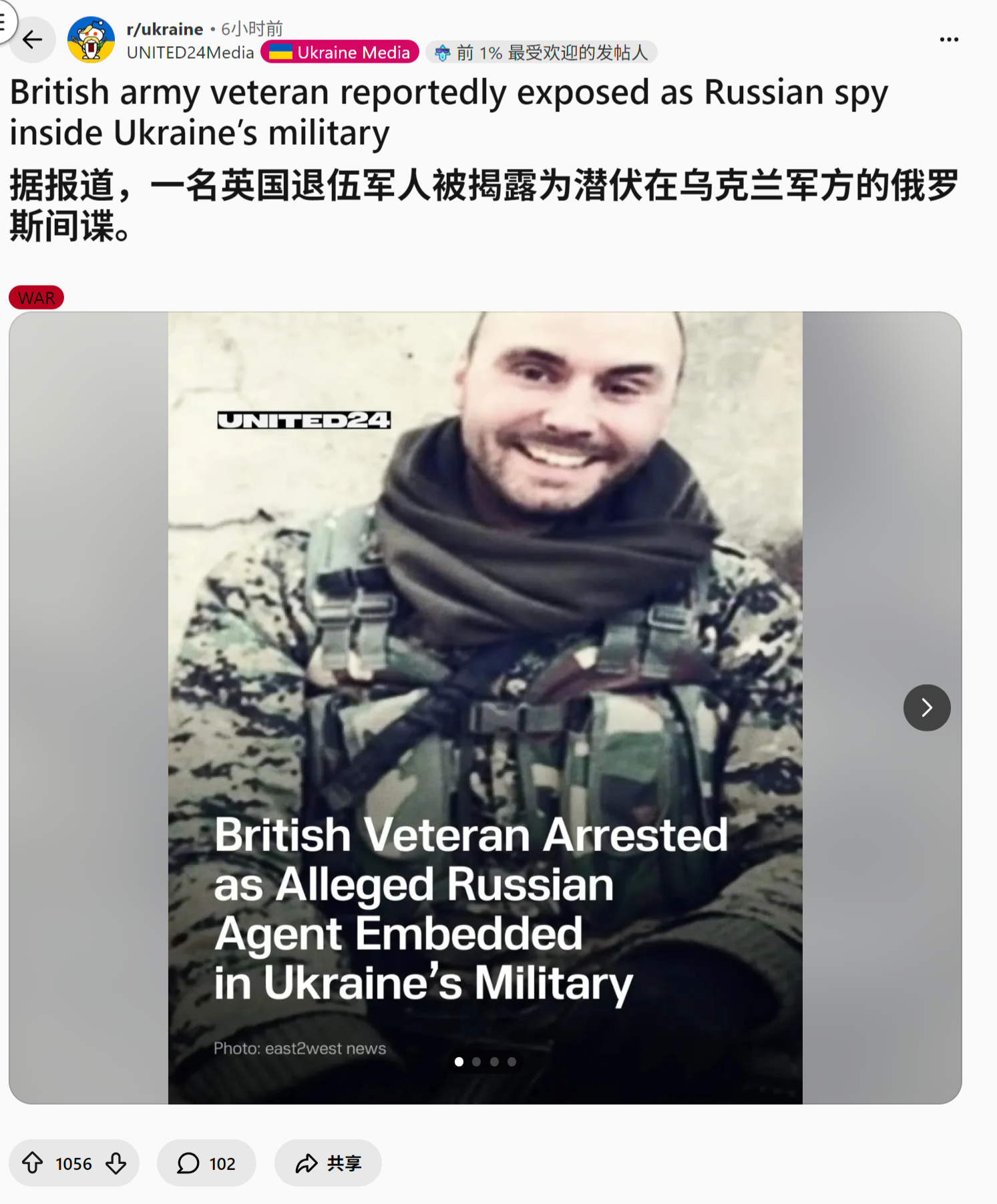 据报道,一名英国退伍军人被揭露为潜伏在乌克兰军方的俄罗斯间谍。