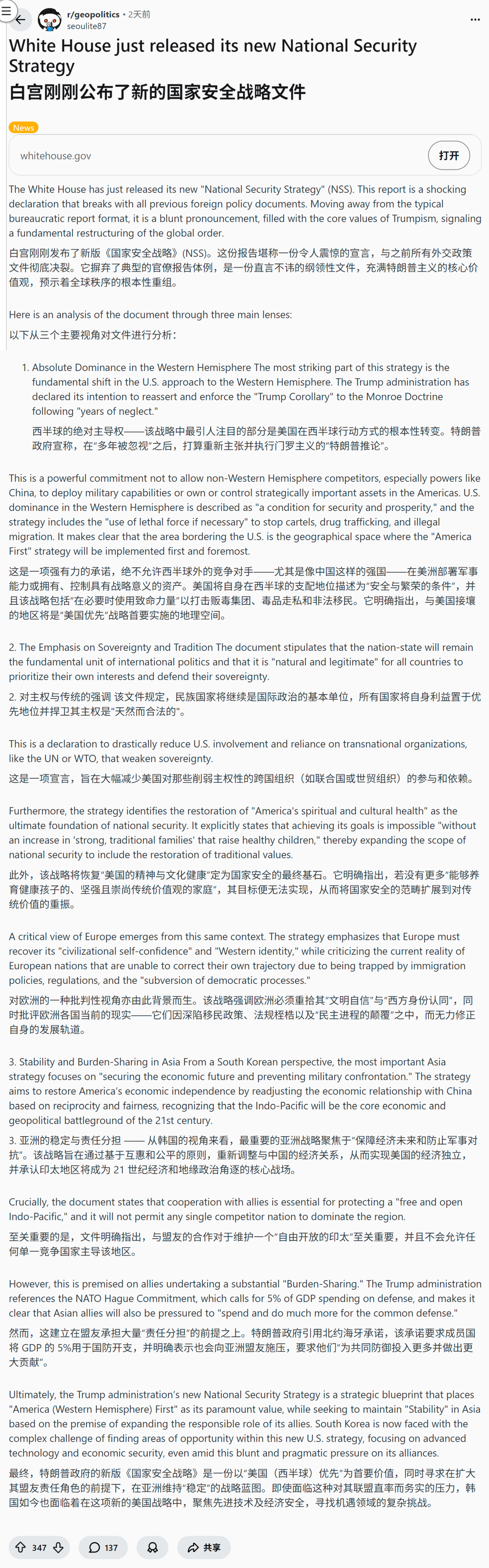 reddit热议美国人怎么看白宫刚刚公布了新的国家安全战略文件