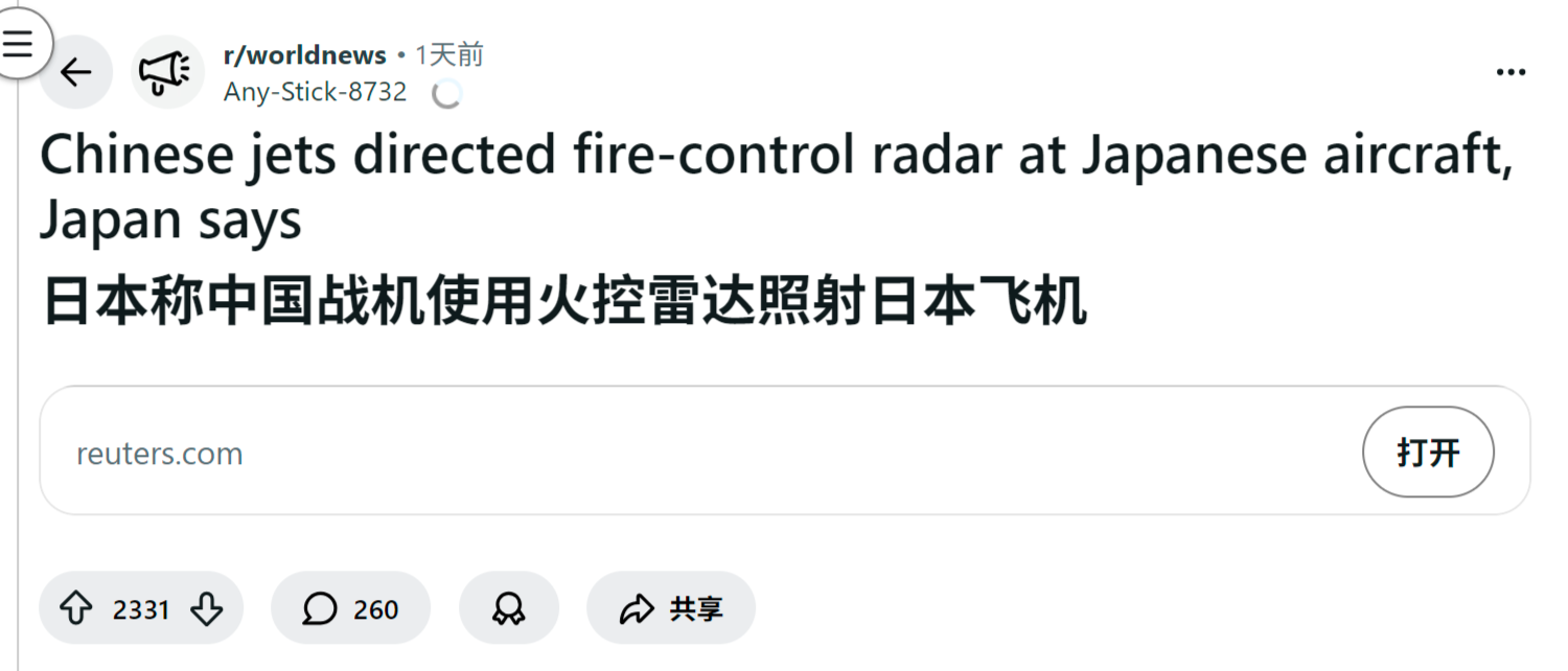 reddit热门 老外怎么看日本称中国战机使用火控雷达照射日本飞机