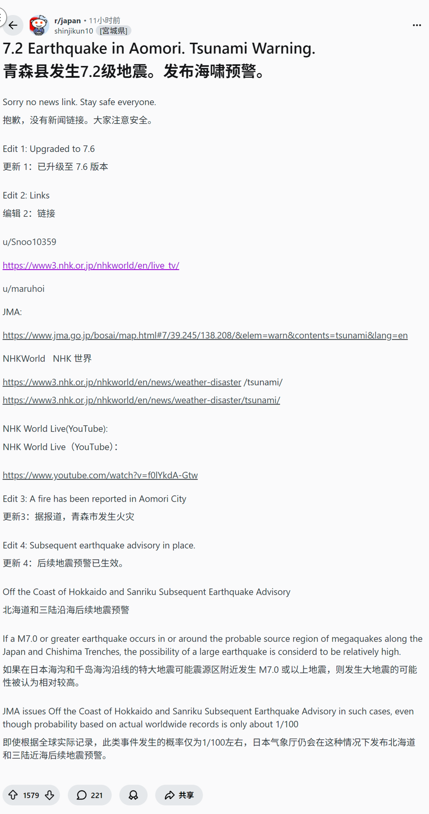 来源:https://www.reddit.com/r/japan/comments/1phdm3w/72_earthquake_in_aomori_tsunami_warning/