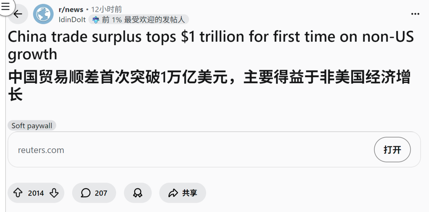 reddit热议 中国贸易顺差首次突破1万亿美元,主要得益于非美国经济增长