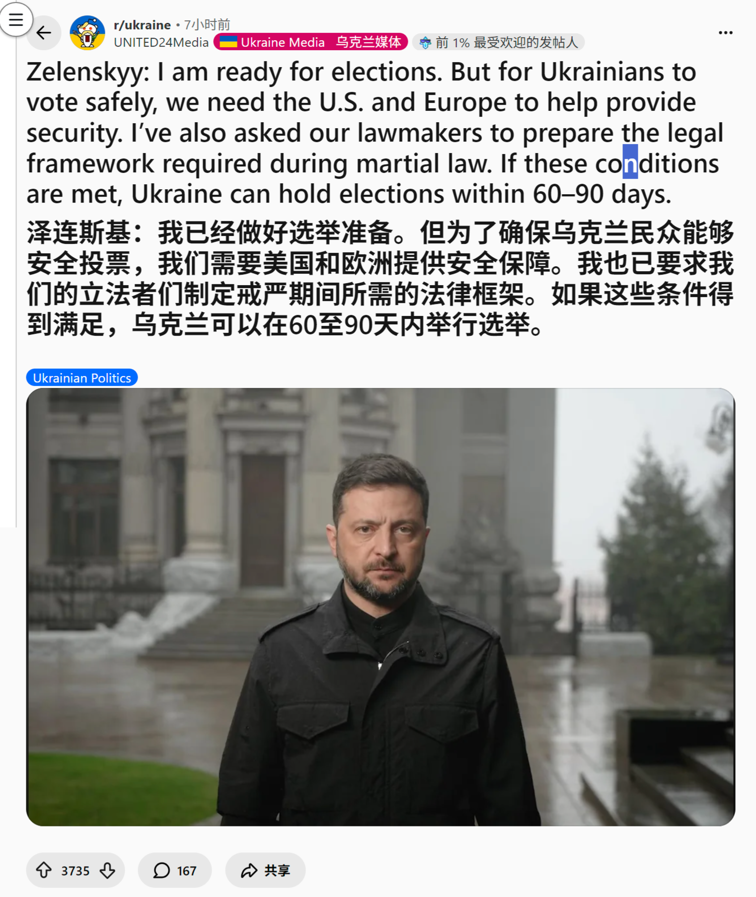 来源:https://www.reddit.com/r/ukraine/comments/1pihyrj/zelenskyy_i_am_ready_for_elections_but_for/