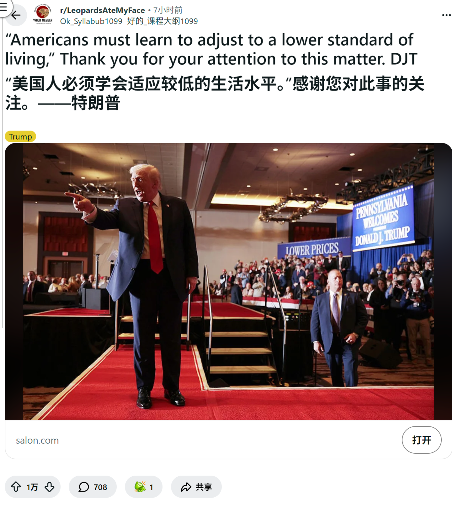 reddit爆火 外国人怎么看特朗普说美国人必须学会适应较低的生活水平