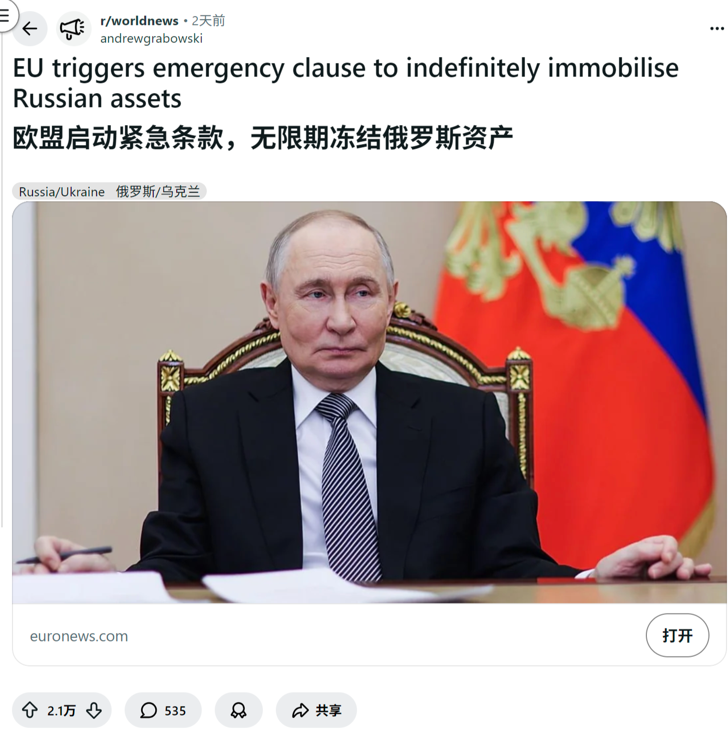 reddit热议 欧盟启动紧急条款,无限期冻结俄罗斯资产
