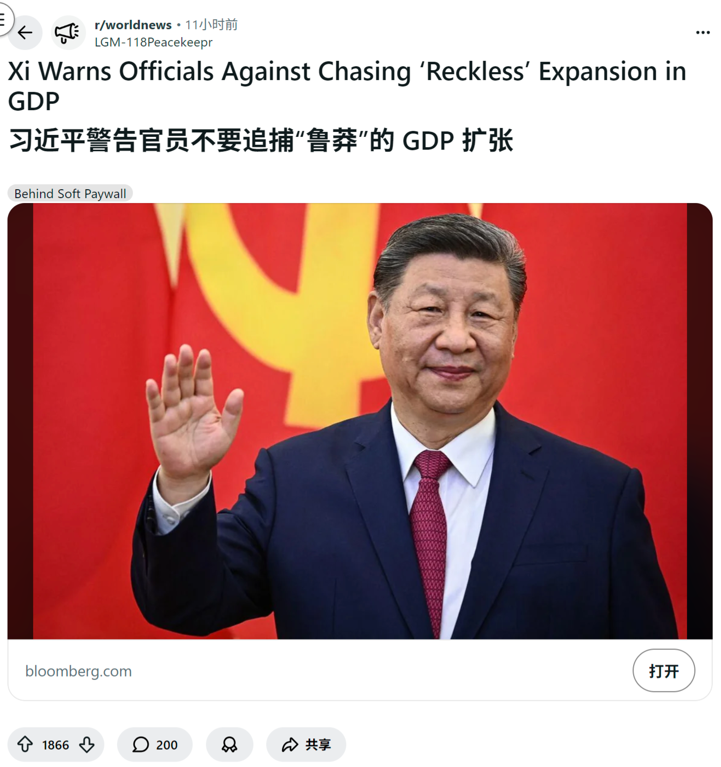 来源:https://www.reddit.com/r/worldnews/comments/1pn8vb6/xi_warns_officials_against_chasing_reckless/