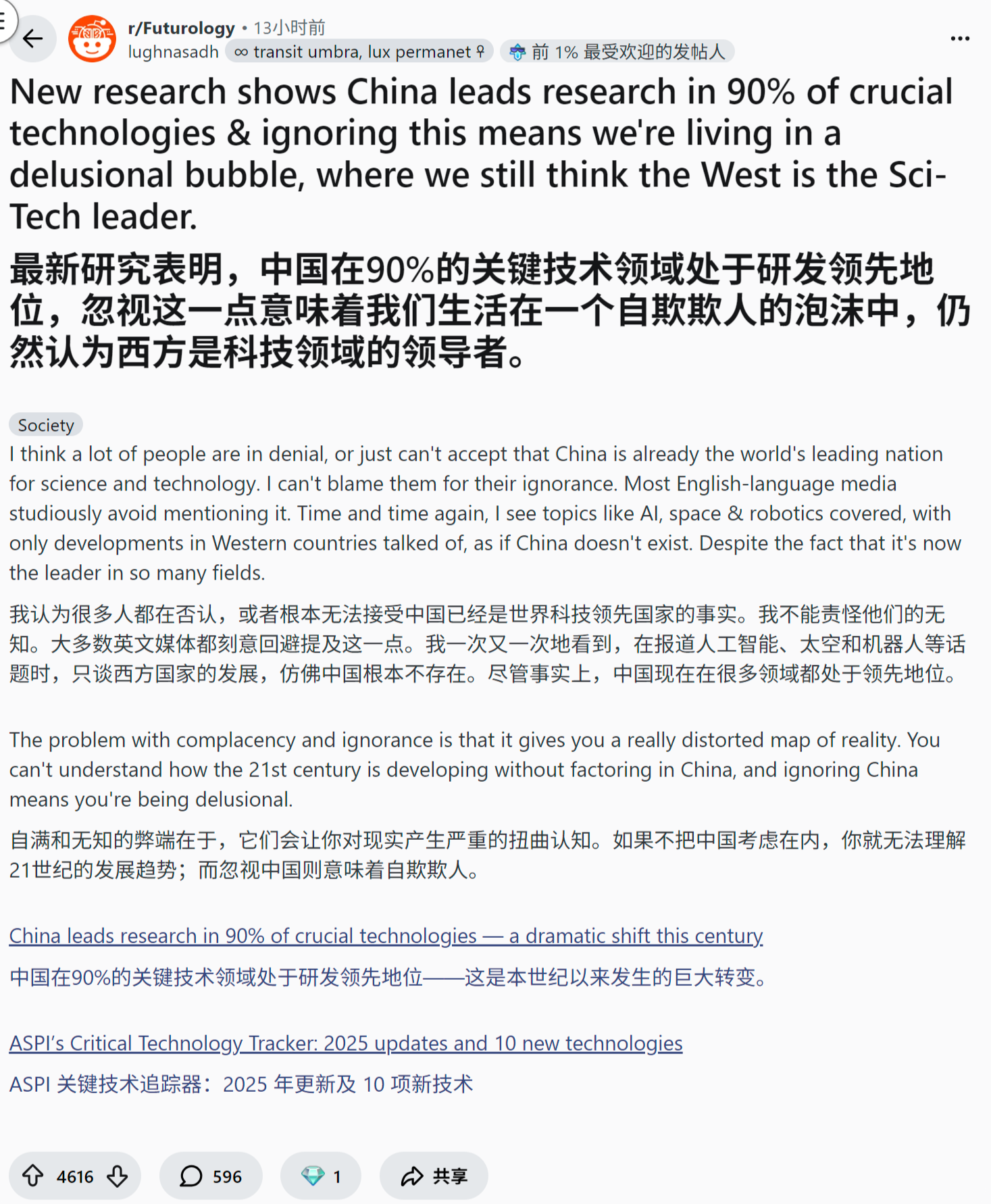 reddit热议 最新研究表明中国在90%的关键技术领域处于研发领先地位