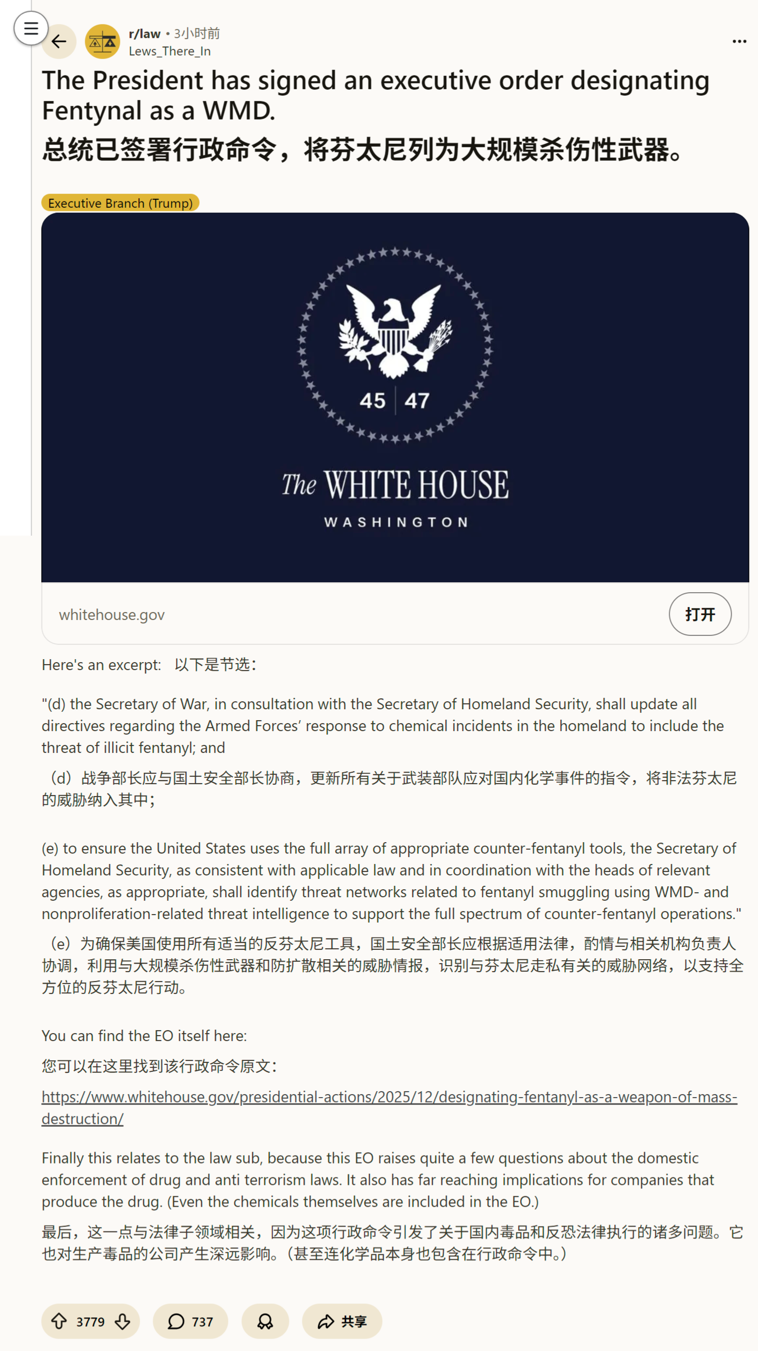 reddit热议 总统已签署行政命令,将芬太尼列为大规模杀伤性武器