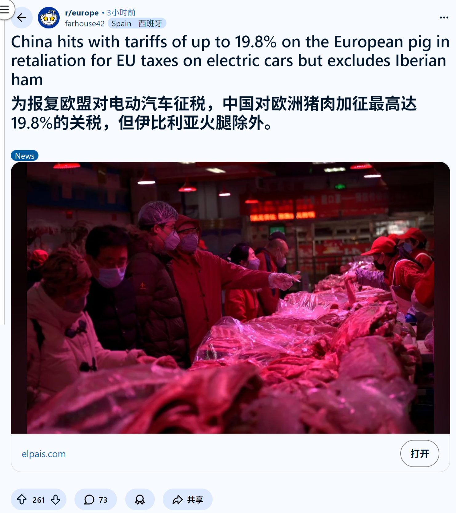 reddit热议 欧洲人怎么看为报复欧盟对电动汽车征税,中国对欧洲猪肉加征最高达19.8%的关税