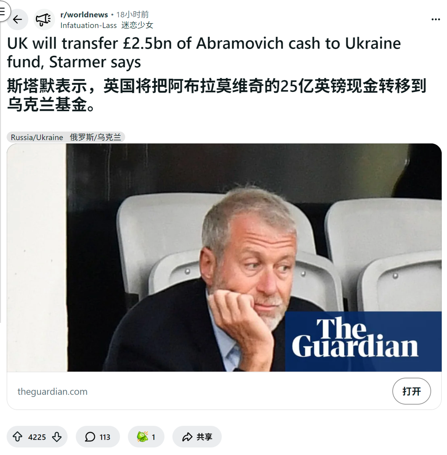 reddit热议 斯塔默表示,英国将把俄罗斯富豪阿布拉莫维奇的25亿英镑现金转移到乌克兰基金