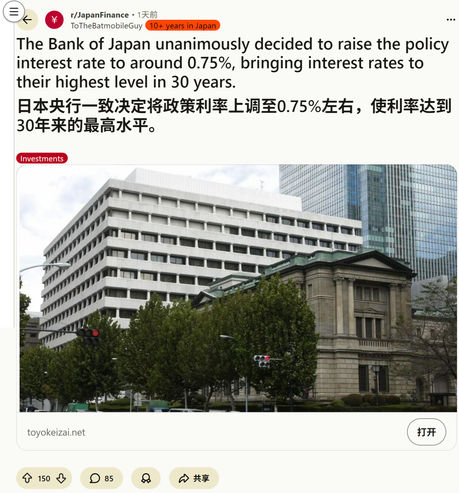 reddit热议 日本人怎么看日本央行一致决定将政策利率上调至0.75%左右,使利率达到30年来的最高水平