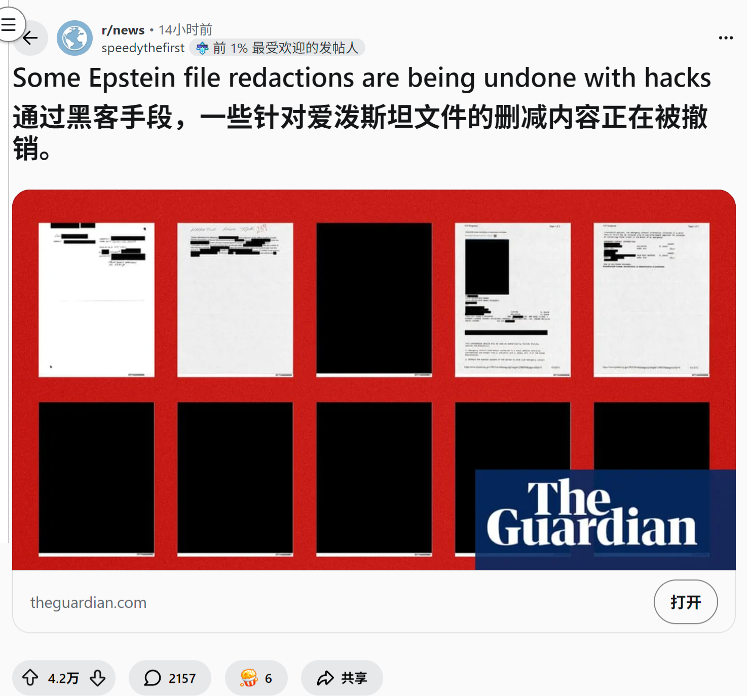 reddit爆火 美国人怎么看通过黑客手段,一些针对爱泼斯坦文件的删减内容正在被撤销