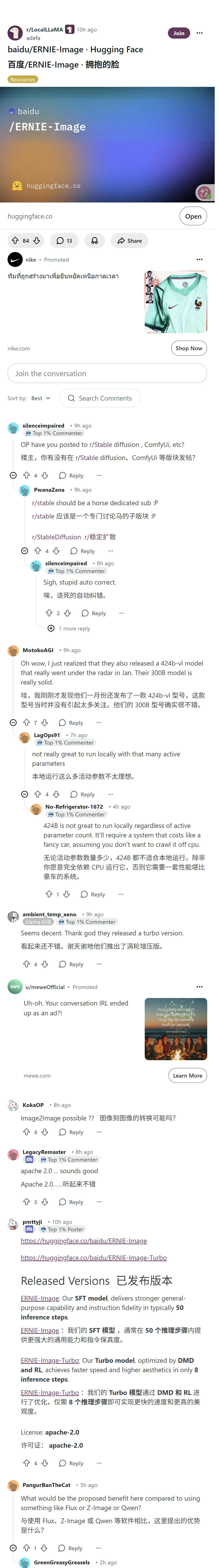 用户分享了该模型两个版本:通用版ERNIE-Image与加速版ERNIE-Image-Turbo,采用Apache 2.0许可证。网友讨论指出百度此前悄悄发布的424B多模态模型不适合本地运行,有用户询问是否支持图生图,也有用户对比其他模型探讨该模型的优势。
