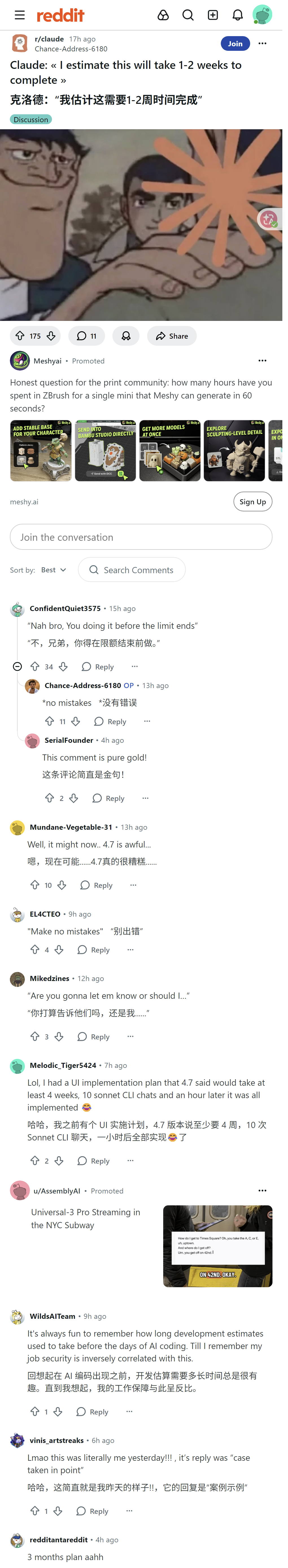 这条Reddit内容提到Claude预估某项任务需1-2周完成,评论区网友调侃实际会提前做完,帖主回复称没有错误,还有人吐槽4.7版本难用,分享用AI快速完成原预估数周的开发工作,也有人感慨AI影响工作安全感。