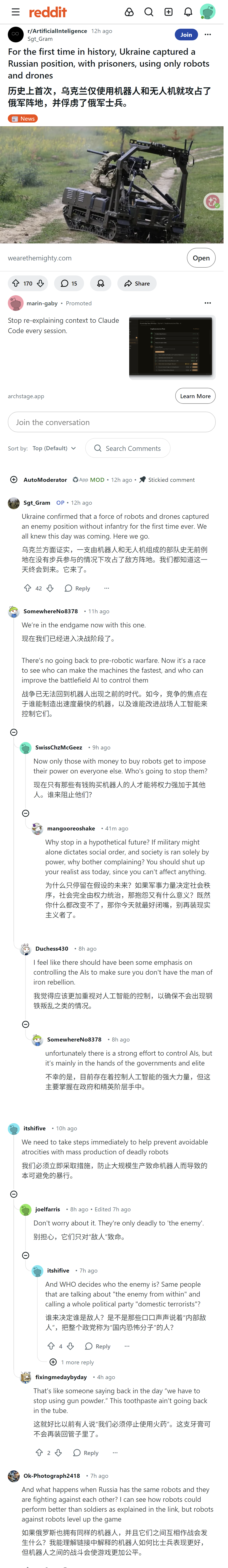 网友对此事讨论热烈,有人称战争已无法回到前机器人时代,AI控制技术成竞争关键,技术掌握在精英政府手中,需防范风险;也有人认为技术进步不可逆,还有人看好此事对乌克兰的帮助。